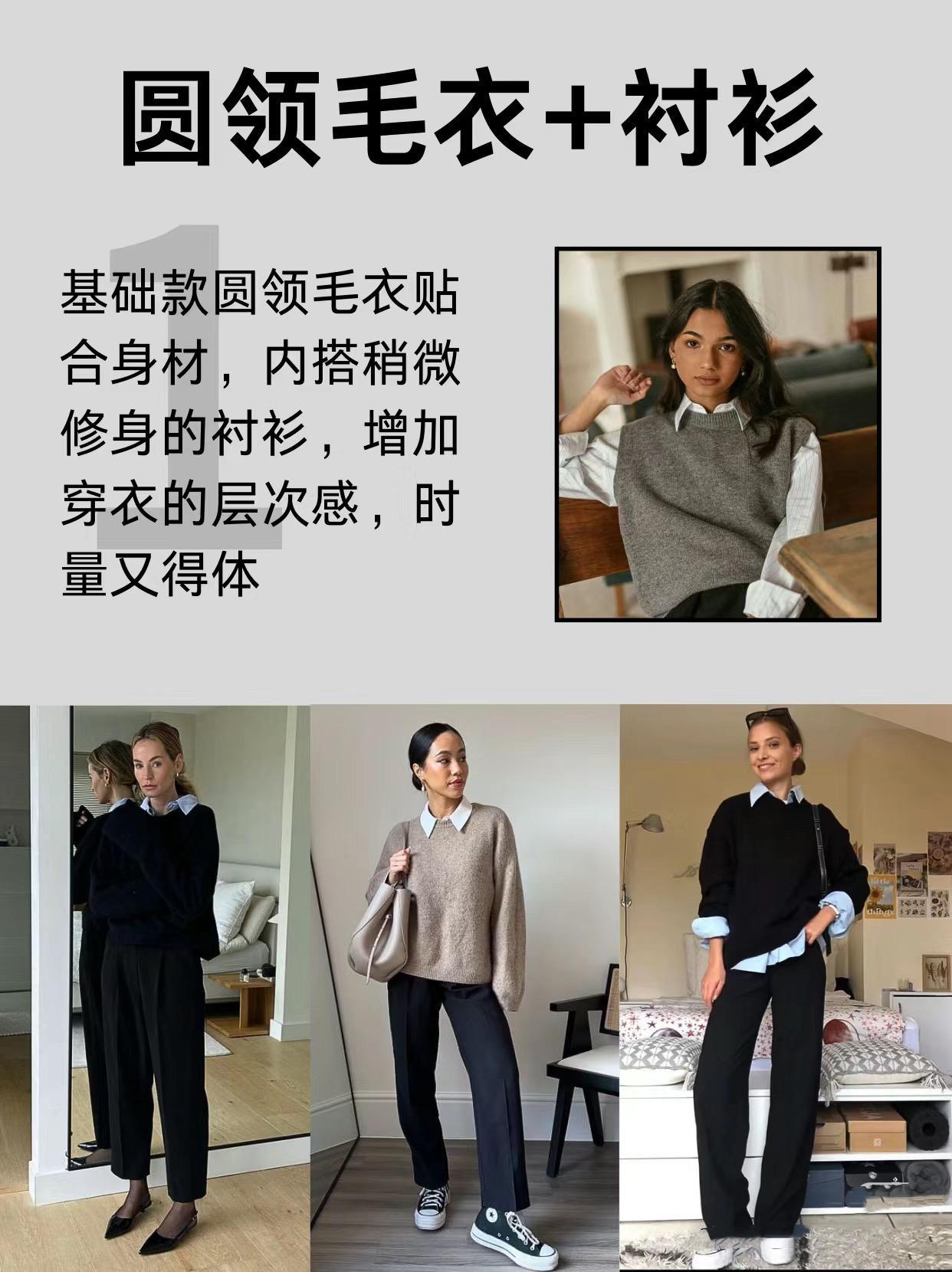 基礎款的圓領毛衣,相對修身的款式,可以配更合身一點的襯衫。襯衫作爲內搭,可以豐富層次感,時髦又得體,上班通勤也很有範。
