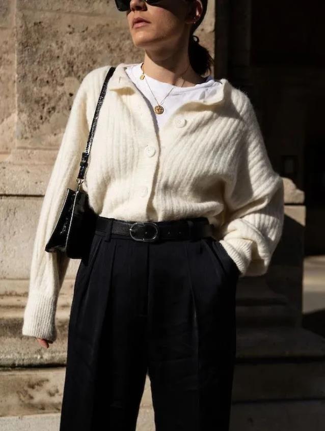 白色的毛衣開衫,在這個早秋又怎能不給自己入手一件呢?搭配一條黑色闊腿褲,襯托得整個人又瘦又高,能輕鬆穿出大長腿的既視感。內搭一件白色t恤,不僅時髦休閒和耐看,這樣經典的穿搭是最能夠展現出女性獨立和魅力的,也展現出一種不俗的氣質。