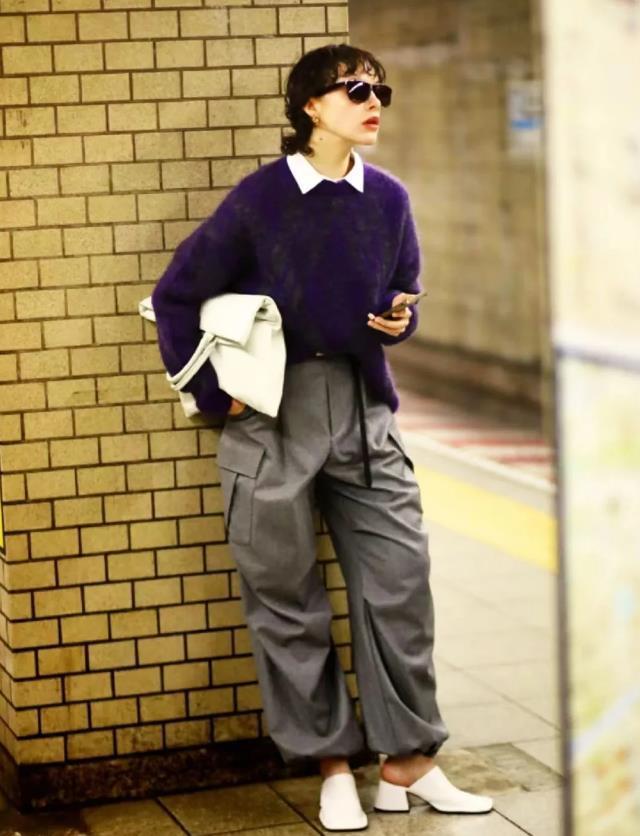 進入早秋後,穿搭也不要一味追求過於沉悶了,給自己選擇一件亮色的毛衣來穿,會讓你看起來更吸睛洋氣。紫色毛衣配灰色工裝褲,很好詮釋了屬於女性的氣質和帥氣,毛衣裏面內搭了一件白色襯衫,一定要記得將衣領露出來,增加層次感,又能展現出一個人的穿着品味。