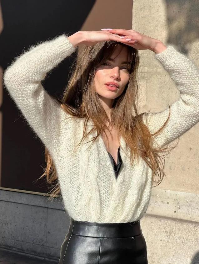 暖白色的針織毛衣,這個色調看起來就非常溫柔,搭配一件黑色真皮半身長裙,將屬於大女人的範盡顯出來了,獨立自信又充滿了魅力,還能讓穿着者展現出幹練利落,同時展現出屬於女性的成熟和高級。