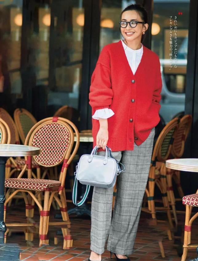 紅色的毛衣開衫搭配格紋闊腿褲,遵循了上簡下繁的組合,實在是太時髦好看了,毛衣開衫裏面內搭了一件白色圓領襯衫,這樣的組合可以將女性的獨立和自信都呈現出來,給人展現出一種迷人的氣息,搭配一雙黑色高跟鞋,就又多了幾分優雅和女人味。