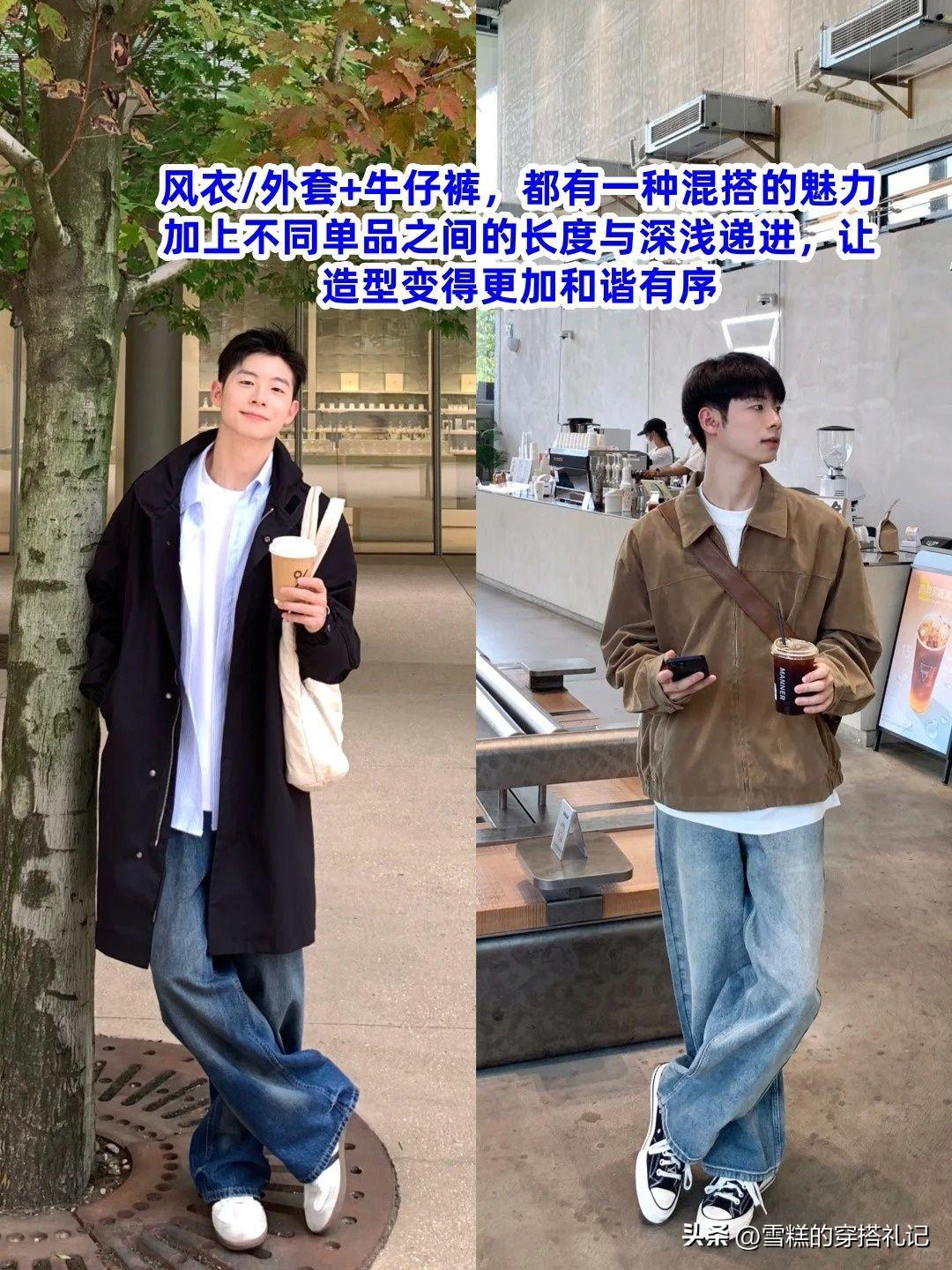 搭配列舉:牛仔直筒褲+基礎色打底衫+中長款風衣/針織開衫