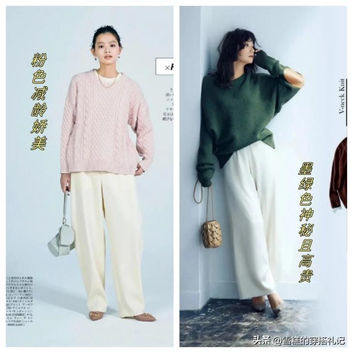 搭配①:彩色毛衣+闊腿褲,演繹慵懶減齡風