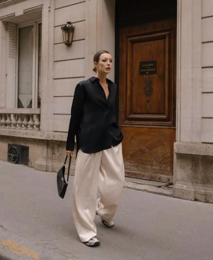 喜歡黑白配帶來的那種極簡風,白色闊腿褲搭配黑色襯衫,上下各自的版型都是非常寬鬆的,組合在一起,就能展現出一種隨性,能夠將大女人的獨立和休閒都呈現出來,選擇一雙運動鞋來配,瀟灑又不失個性。