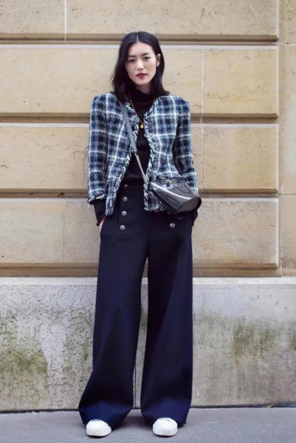 藏藍色闊腿褲,和黑色一樣,都是最顯沉穩和顯瘦的,搭配一件小香風外套,把個人的氣質很好展現出來,也非常時髦,適用於各種場合。鞋子的話,可以選擇一雙小白鞋來配,剛柔並濟的風采,也盡情將大女人的氣質演繹出來。