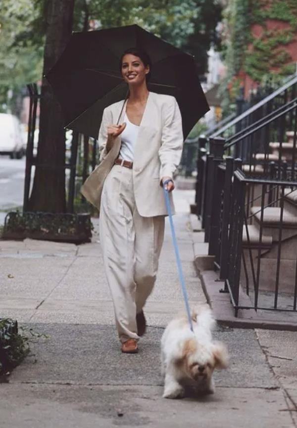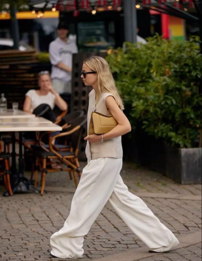 白色拖地闊腿褲,不要覺得自己駕馭不了這種長度的褲子,實際上穿起來並沒有太大的壓力,白色拖地闊腿褲+淺咖色馬甲,彰顯出了個人品味和風格,也將屬於女性的率性和氣場打造出來,打造屬於大女人的氣場。