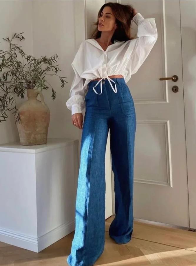水牛仔藍高腰闊腿褲,搭配一條白色圓領襯衫,這樣的搭配在視覺上能給人營造出一份從容和高挑感,搭配一雙平底鞋後,又讓整個穿搭多了幾分輕鬆與自在,反正就有種隨性和酷颯感。