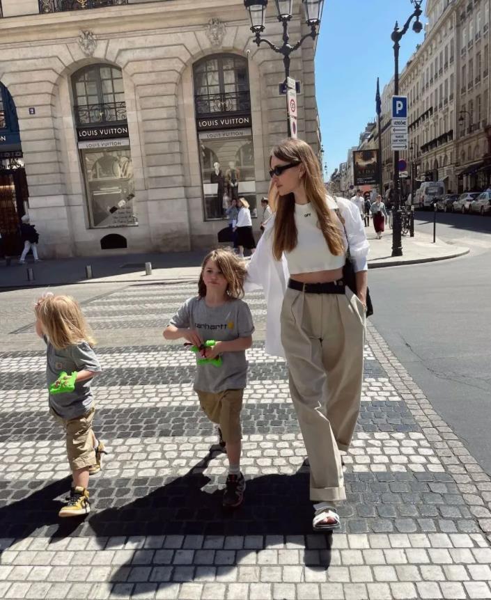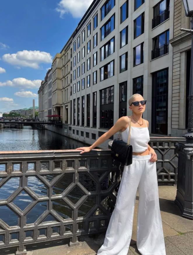 比起一身黑,我更偏向一身乾淨的白色,白色闊腿褲搭配白色牛仔外套,外套裏面還疊穿了一件性感的小背心,將女性的帥氣和性感都完美演繹出來,搭配上一雙高跟鞋,又多了幾分幹練和魅力。