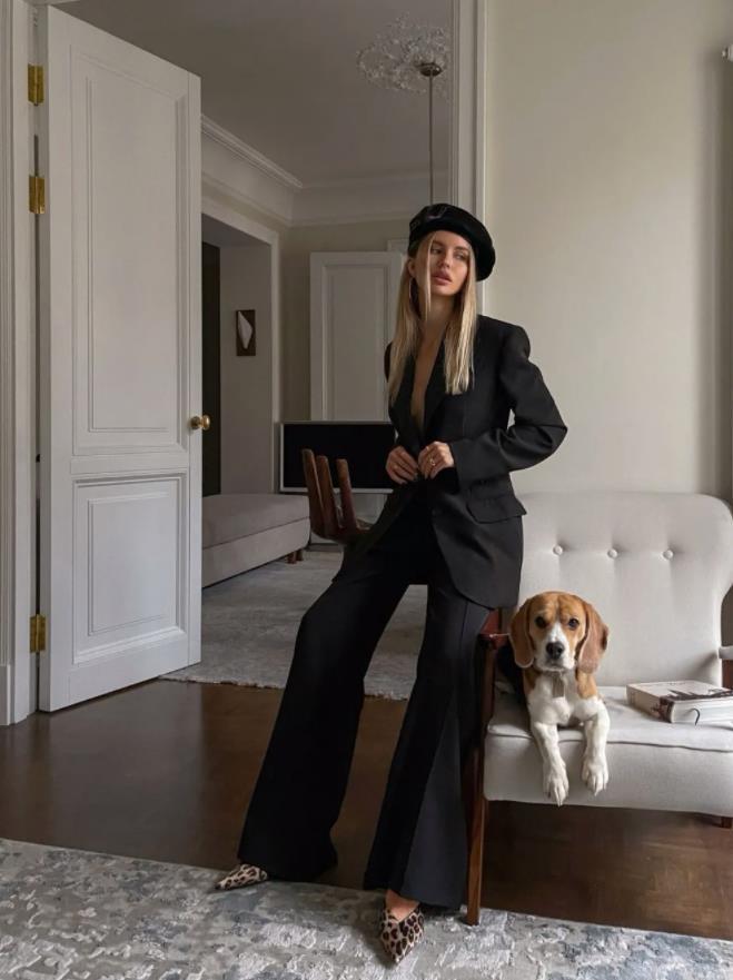 對於身在職場的姐妹們,黑色西裝和西裝褲都是專屬單品,所以,將這兩種單品組合在一起,並沒有什麼不妥。黑色西裝外套+西裝闊腿褲,輕鬆就打造出一個獨立自信的女人,也讓整個人的氣場提升起來,搭配一雙尖頭平底鞋,腿部線條瞬間就被拉長了。