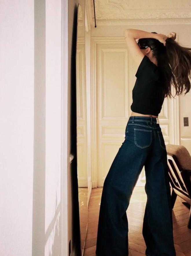 牛仔闊腿褲配黑色短袖t恤,夏天就適合這樣穿,這樣的搭配很不失日常也比較簡單,適合各種場合的穿法,也能營造出幹練利落的氣場。寬鬆的褲子版型,感覺什麼身材都是可以駕馭的,非常顯瘦,顯腿長。