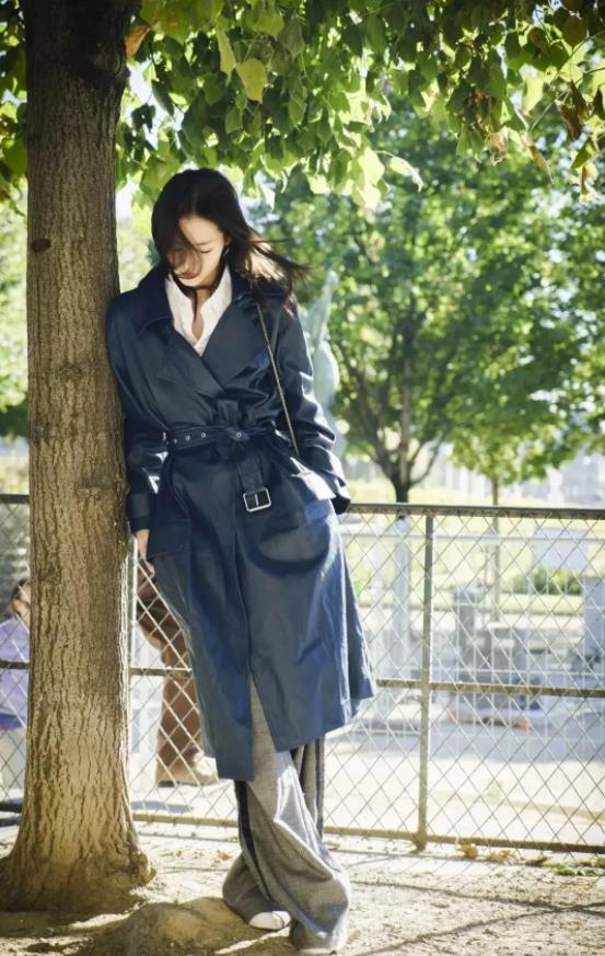 不管是黑色闊腿褲,還是灰色的,都很百搭,灰色高腰闊腿褲搭配一件風衣,裏面還配了一件白色襯衫,輕鬆就打造出時尚大氣感,無形間還能將女性的成熟魅力呈現出來,如果你選擇的是繫腰帶的風衣,還可以將其系起來,既塑造了完美的腰身比例,又顯瘦。