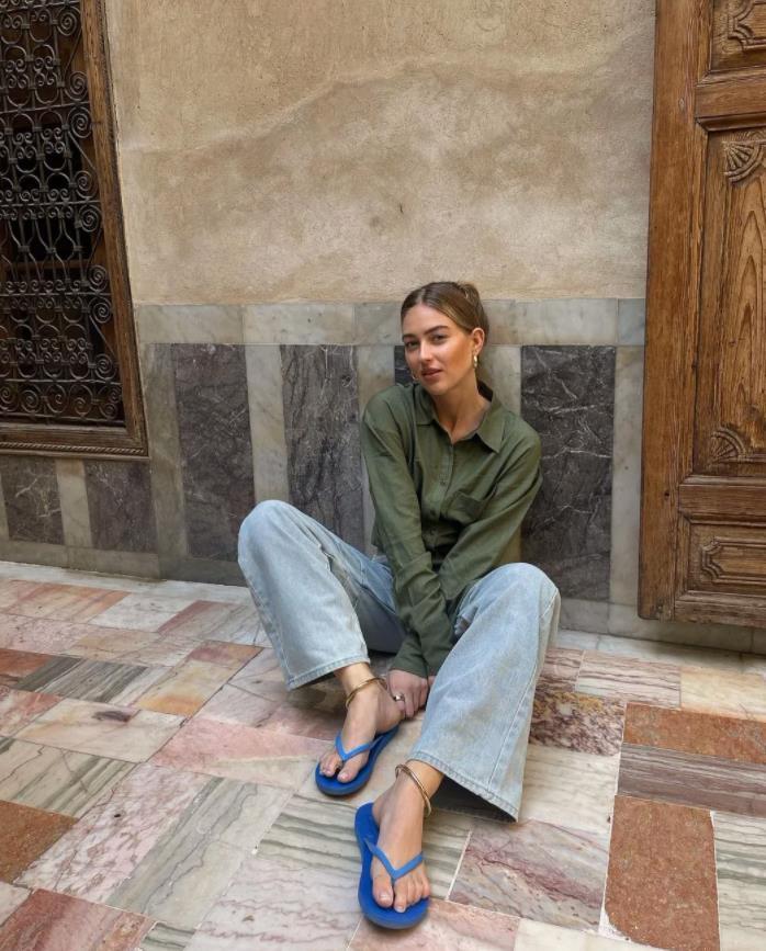 水洗藍淺色牛仔闊腿褲,這個顏色是很經典百搭的,搭配一件軍綠色襯衫,又多了幾分帥氣,也很好彰顯出自信和魅力,選擇一雙深藍色人字拖,就又多了幾分隨意。