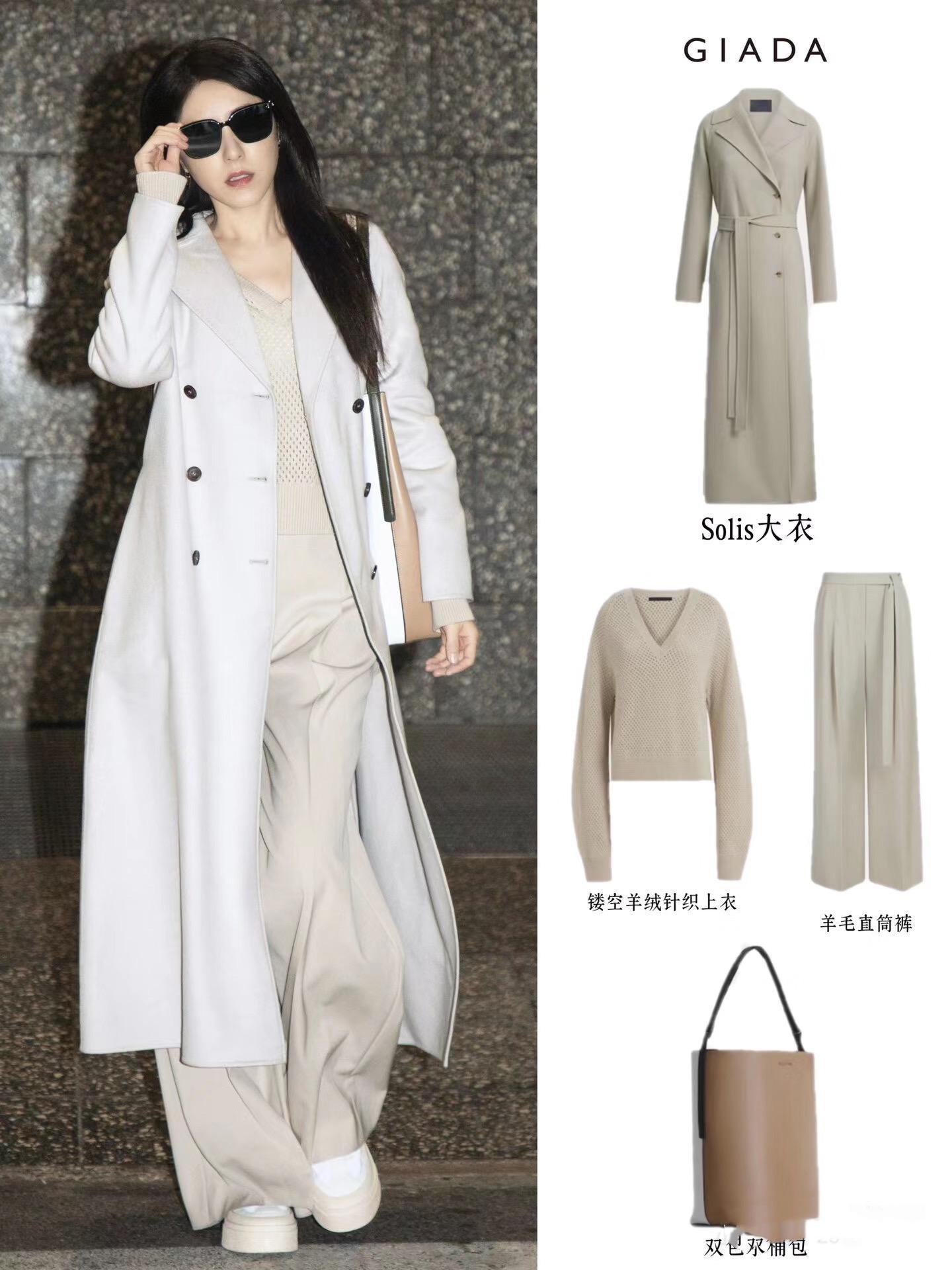 修身打底衫+毛呢闊腿褲作爲內搭,並且在色系上保持了統一,可以增強整體穿搭的協調性。讓曾黎的穿搭,隨性而自在。