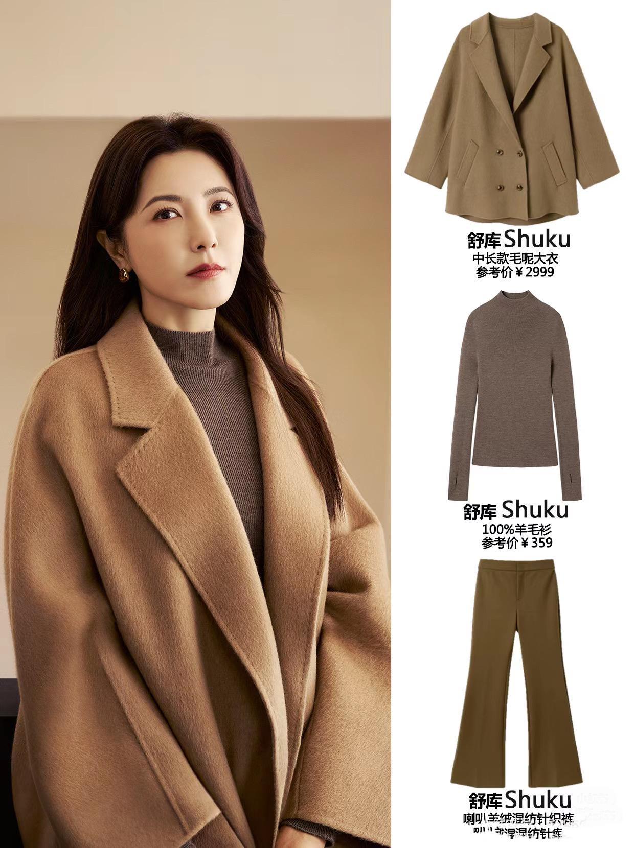 秋冬季節的駝色大衣,棕色相貌深、駝色劇哦腿褲,一身暖色系的穿搭看着好溫暖。這種治癒色系的搭配,也弱化了曾黎身上的強勢,更多了幾分溫婉。