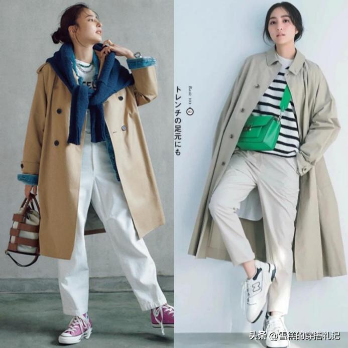風衣最常見的搭配便是搭配平底運動鞋,這是一種比較輕鬆不麻煩的搭配方式,減少了穿搭的突兀,比較適合日常需要走路過多的美眉。並且平底鞋和褲裝、裙裝不管搭配任何風格,都不會顯得違和感。