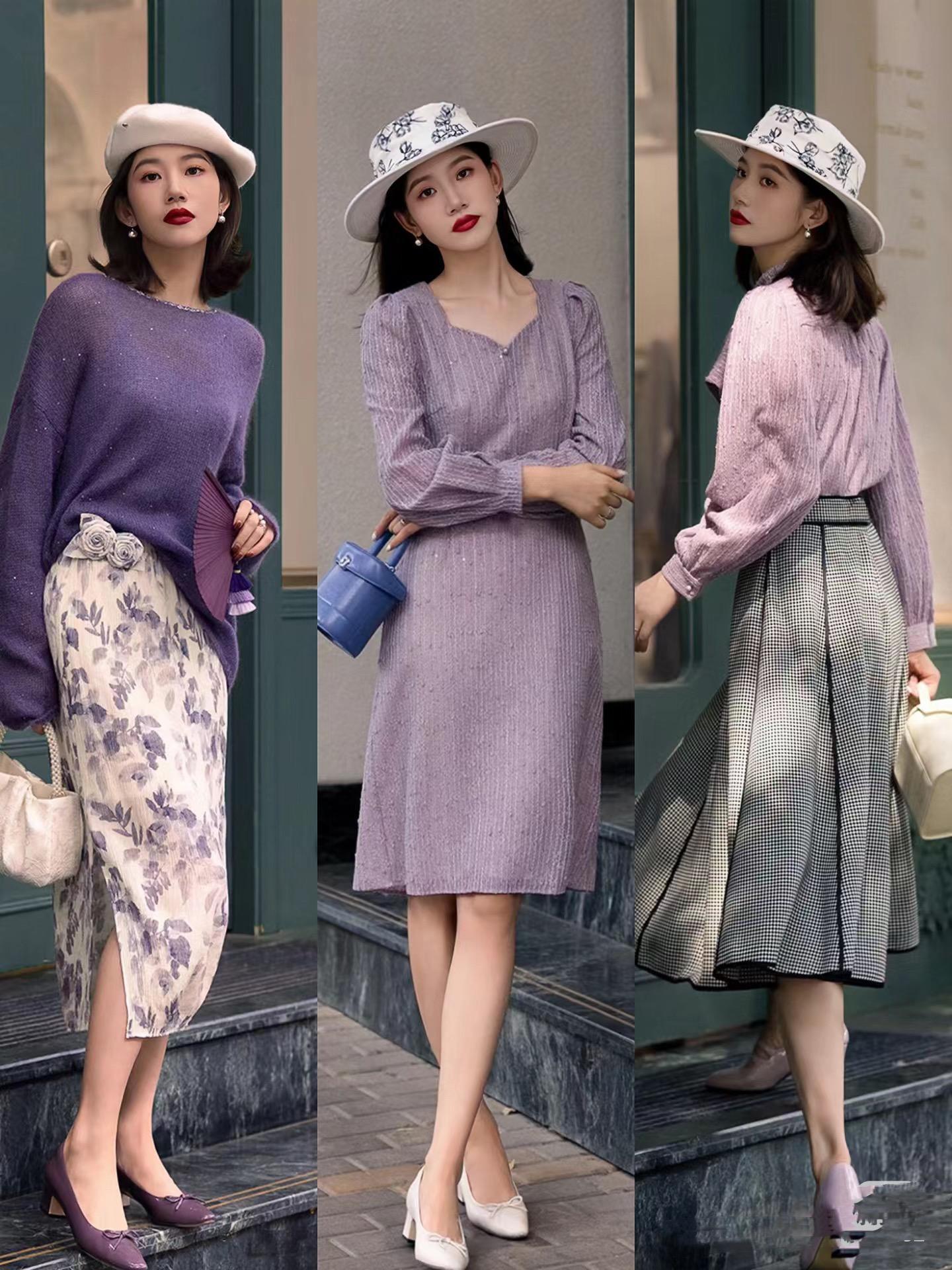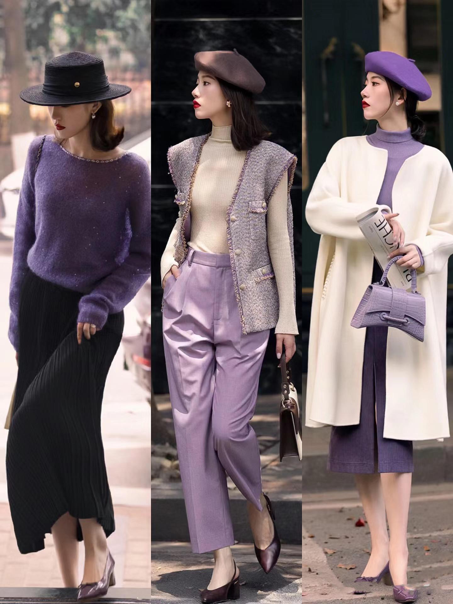 針織衫配半身裙、小香風馬甲、白色大衣,都是優雅貴氣的。當然這些還不夠,紫色針織衫最好配精緻的小禮帽,纔會更洋氣,法式復古風穿搭中,小禮帽也格外實用。
