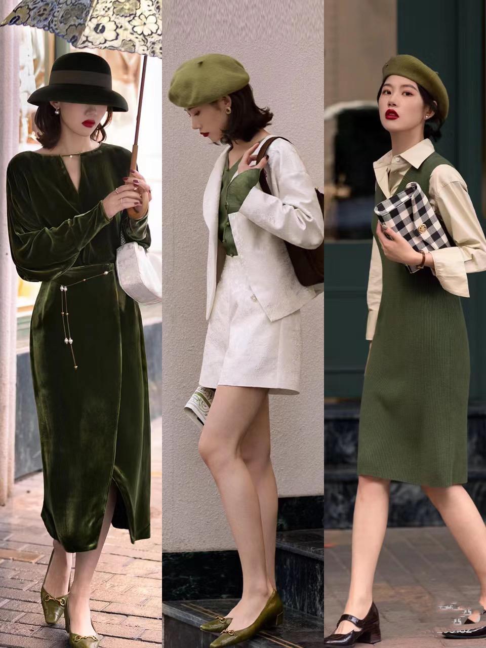 牛油果綠的絲絨連衣裙、以及修身的背心裙、或者打底衫,在這個秋天都承載着復古風的魅力。復古風的表達,與色彩密切相關。