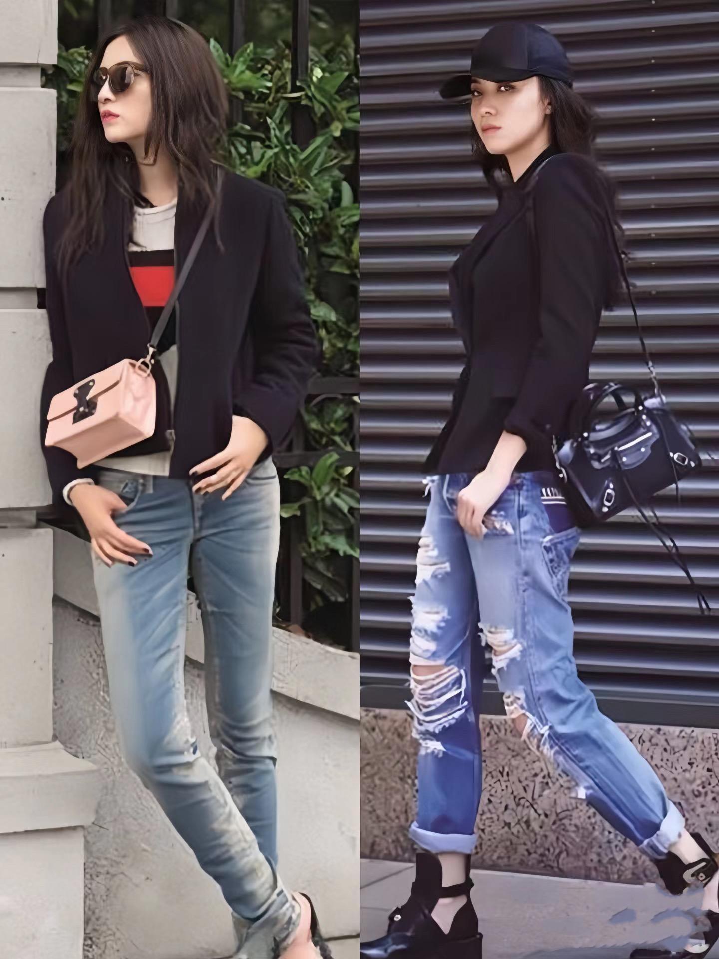 那些年特別流行的小腳牛仔褲、乞丐牛仔褲也被宋佳穿出了新花樣。小腳牛仔褲,配短款夾克風外套,街拍造型好養眼。