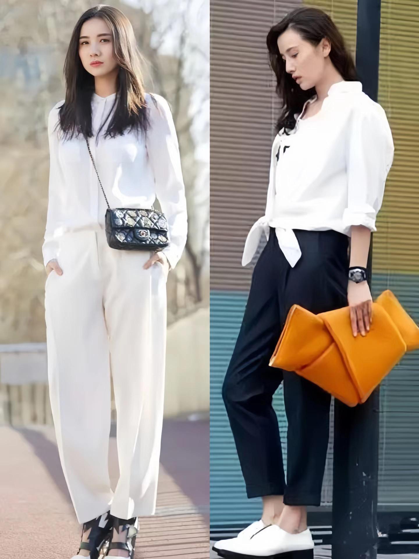 白襯衫+白色煙管褲,那麼純淨的一身穿搭,頗有女神範。