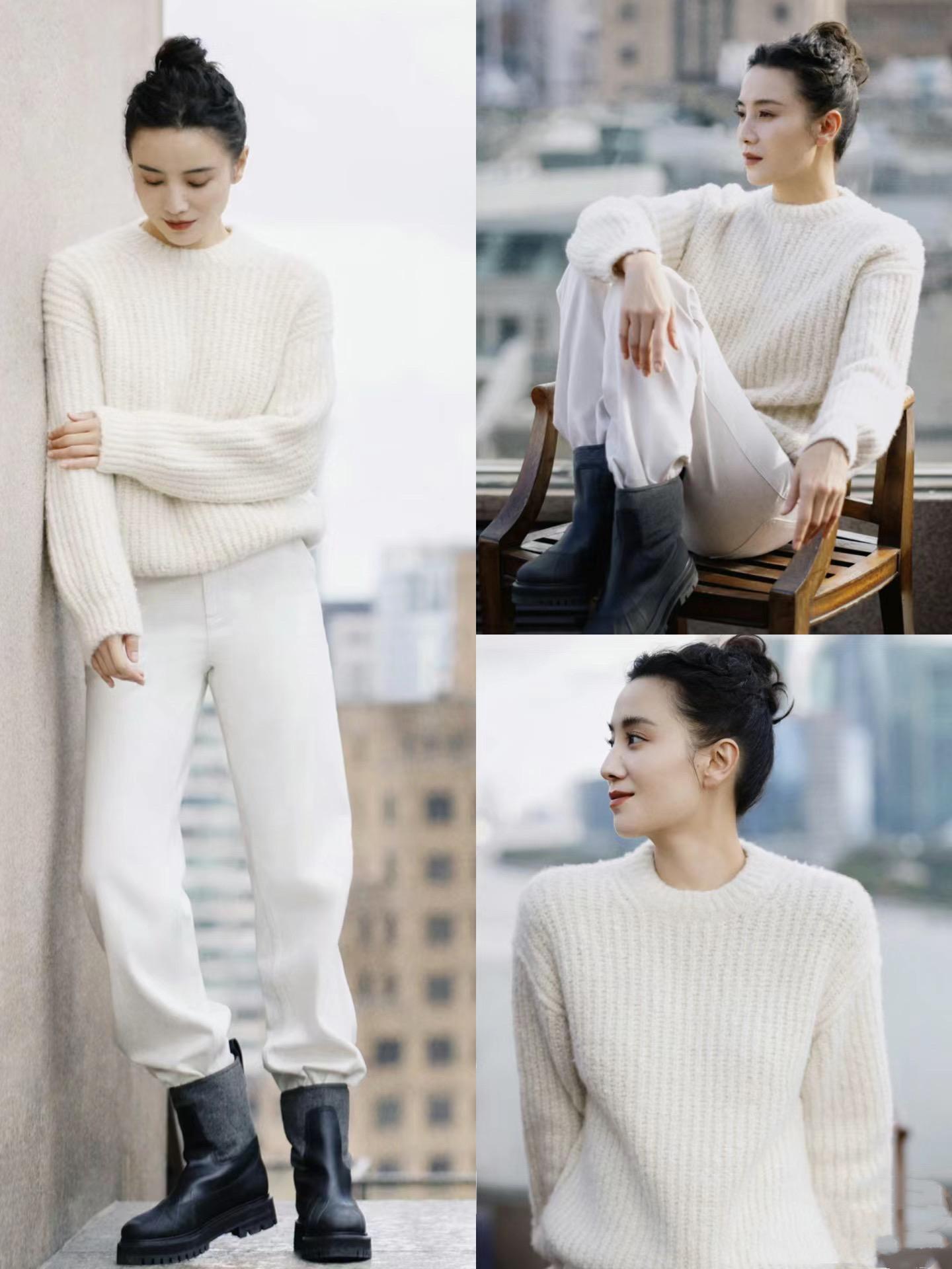 蓬鬆感的盤發,白色毛衣+白色直筒褲,舒適而慵懶。搭配厚底的短靴,帶着力量感、讓穿搭更惹眼。