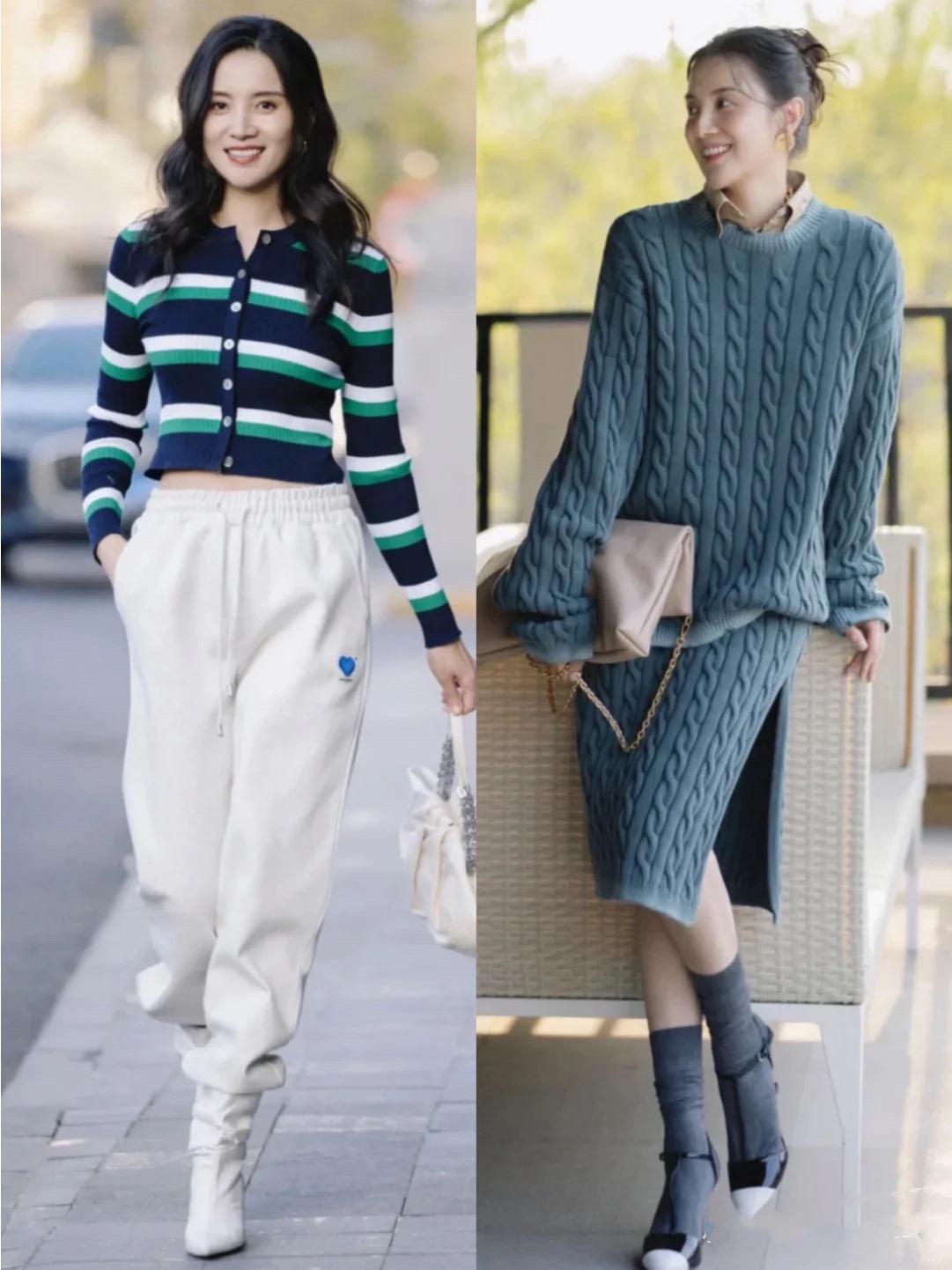條紋針織衫,秀出小蠻腰,搭配束腳運動褲,活潑減齡帶着青春的美感。一雙尖頭的及踝短靴,格外洋氣還顯腿長。