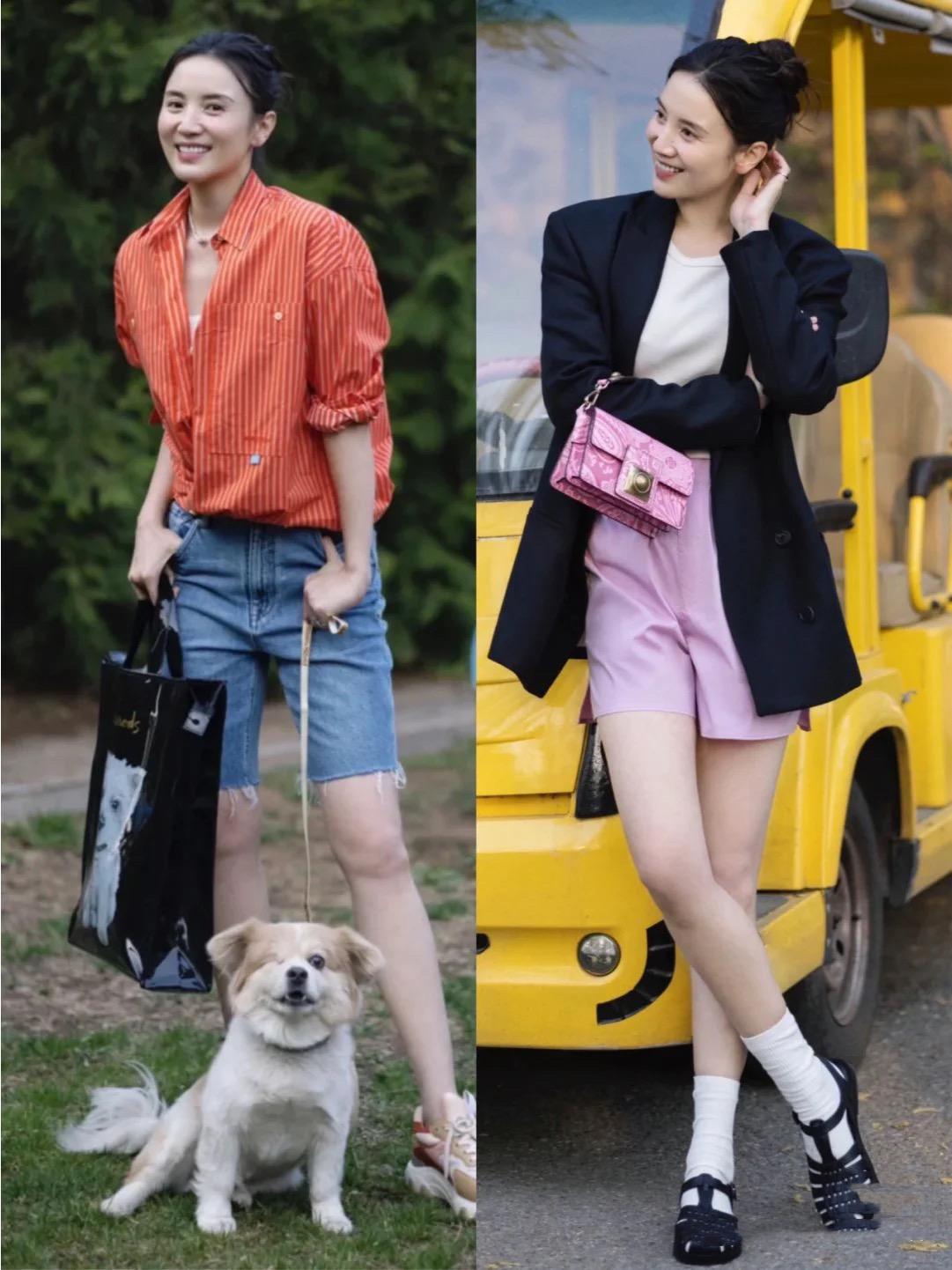 寬鬆條紋襯衫,配上五分牛仔短褲,宋佳這173cm的大高個子真醒目。寬鬆的黑色西服,墊肩款式超高級,配粉色短褲顯得腿更長了。