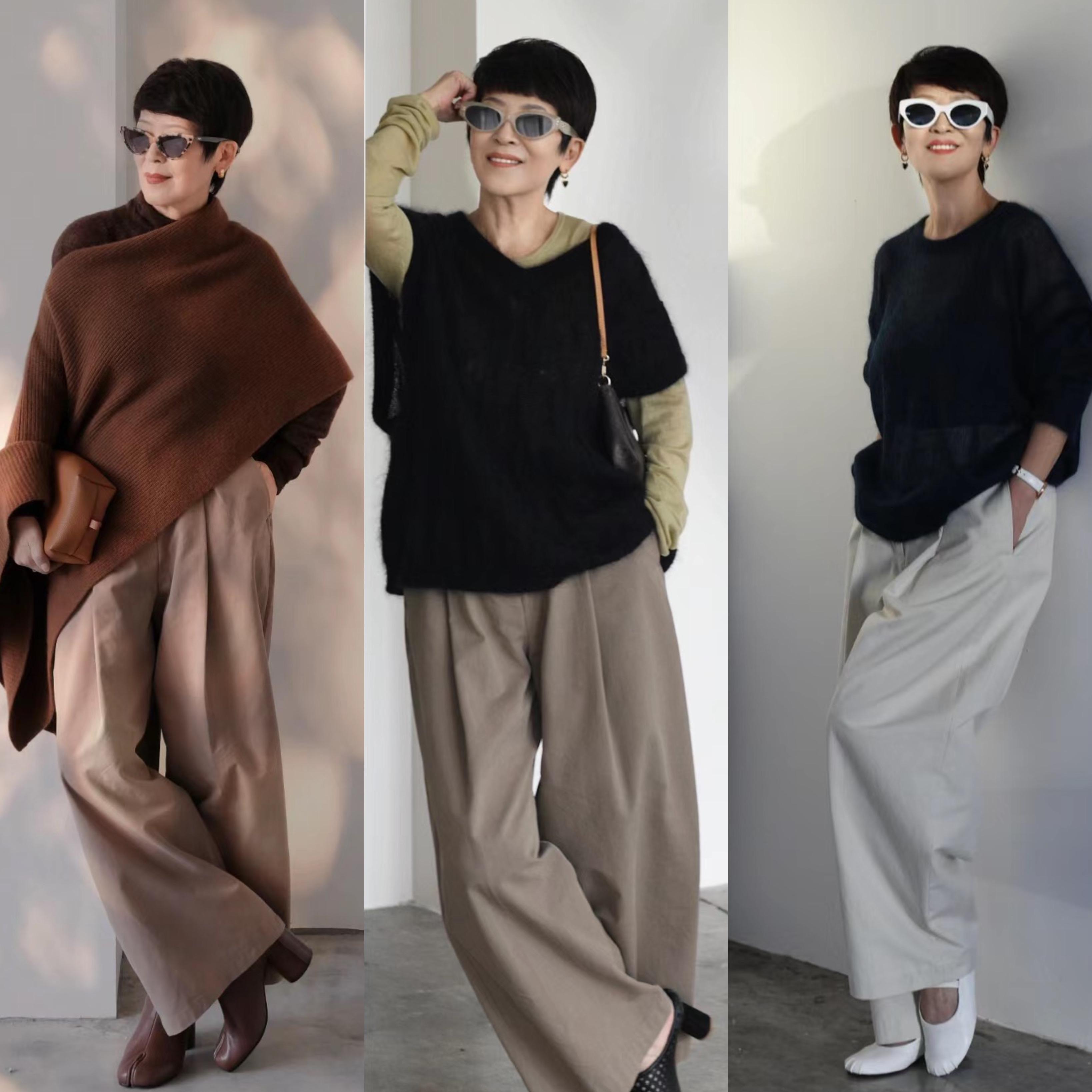 其實對於60+的女人來講,西裝闊腿褲的包容性極強。選擇經典色系、面料厚實垂順的西裝闊腿褲,就更加時髦有範。