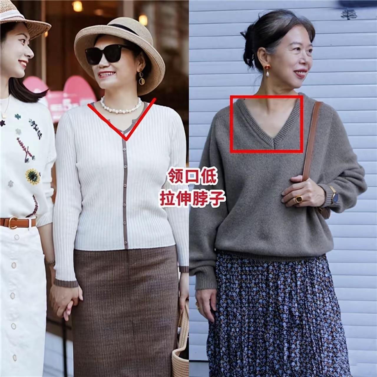 V領的領口,可以優化頭肩比,同時拉伸頸部線條。頭大、肩寬、或者脖頸短粗的女人,都可以起到一定的修飾性。所以對於有點發福的60+女人來講,V領針織衫/打底衫/毛衣都更時尚。
