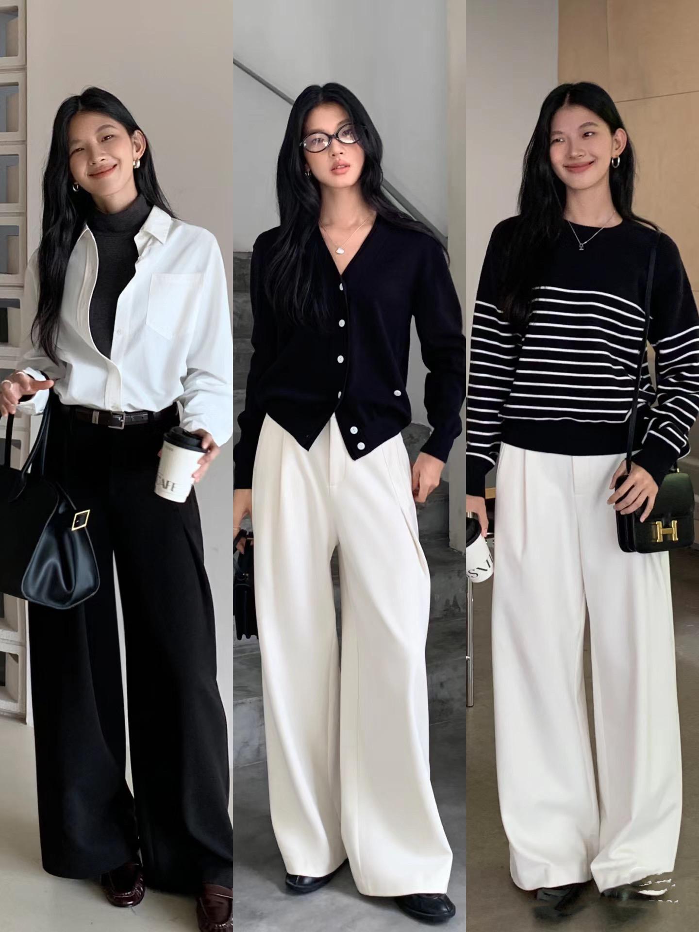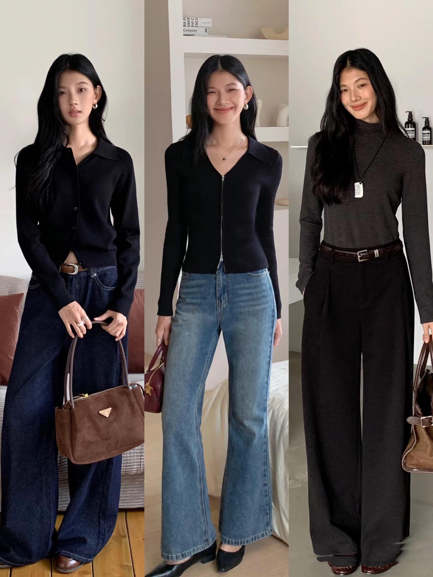 喜歡高級顯瘦、更有氣場的,我們可以搭配深色系。深色系的打底衫,精緻的小紐扣,V領點綴,精緻又迷人,配黑色闊腿褲顯瘦還洋氣。
