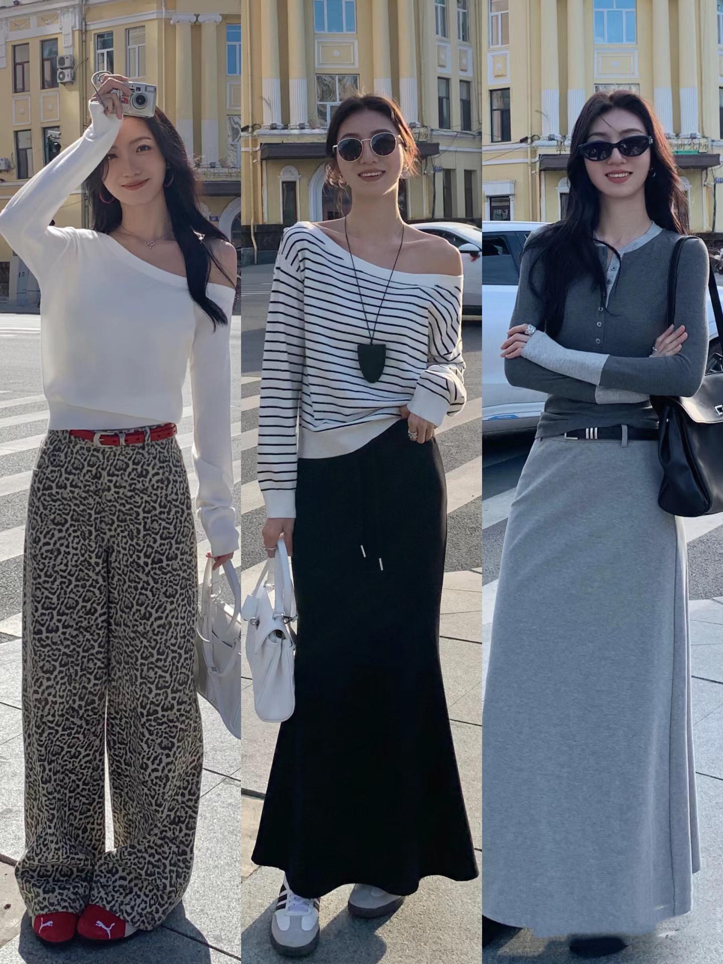 大領口的打底衫,條紋元素的單品,穿起來時髦又精緻。純色系的打底衫,也更加乾淨清爽。當我們嘗試將大領口打底衫拉向一側的時候,造型就更出彩起來。