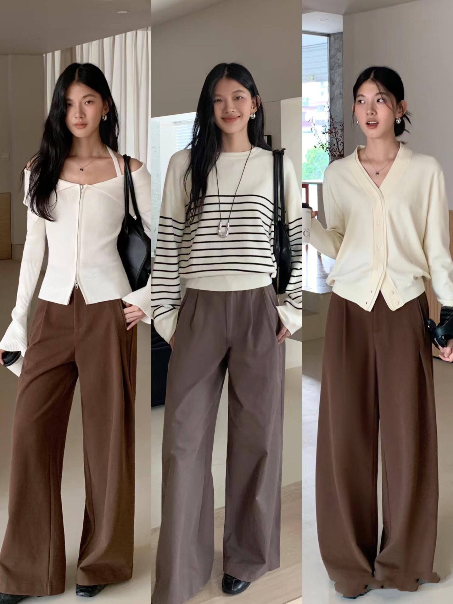 淺色系的針織衫,配上高飽和度的褲子,秋日氛圍就來了。尤其是棕色褲子,帶着幾分暖意,讓秋日穿搭更溫暖,秋天裏棕色闊腿褲,也很有氛圍。