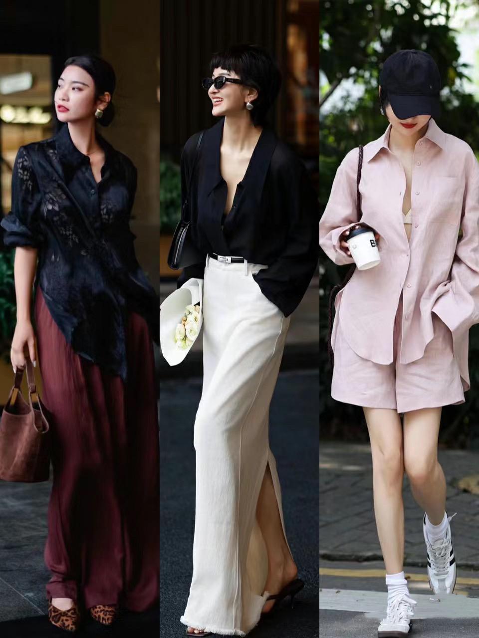 就行經典的黑色襯衫,自然是與白色半身裙更配。黑色襯衫配白色半身裙,優雅穩重。想要更貴氣一點,也可以配酒紅色半身裙,熟女風十足。