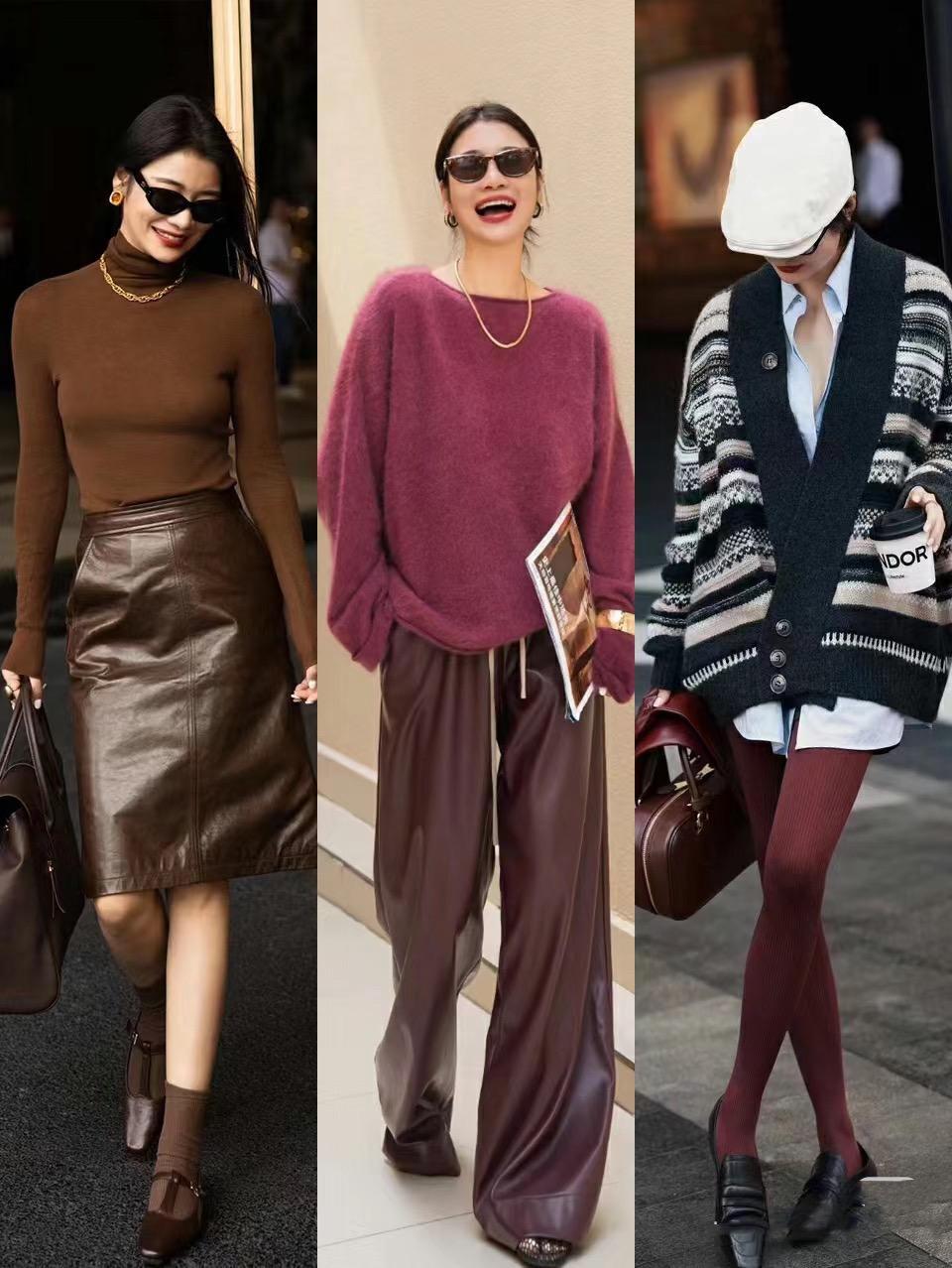 棕色針織衫+棕色皮裙,很醒目的面料對比,讓簡約系穿搭更加熱辣。一身棕色造型,配上黃金項鍊,也是優雅貴氣,棕色針織衫穿起來好溫柔。