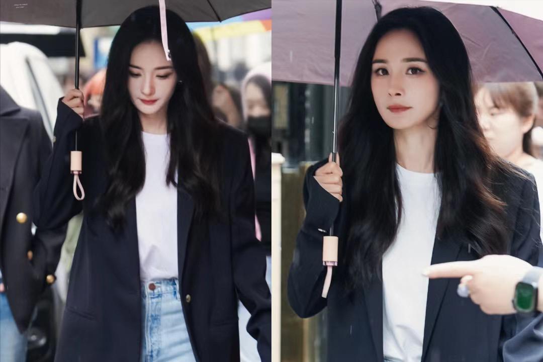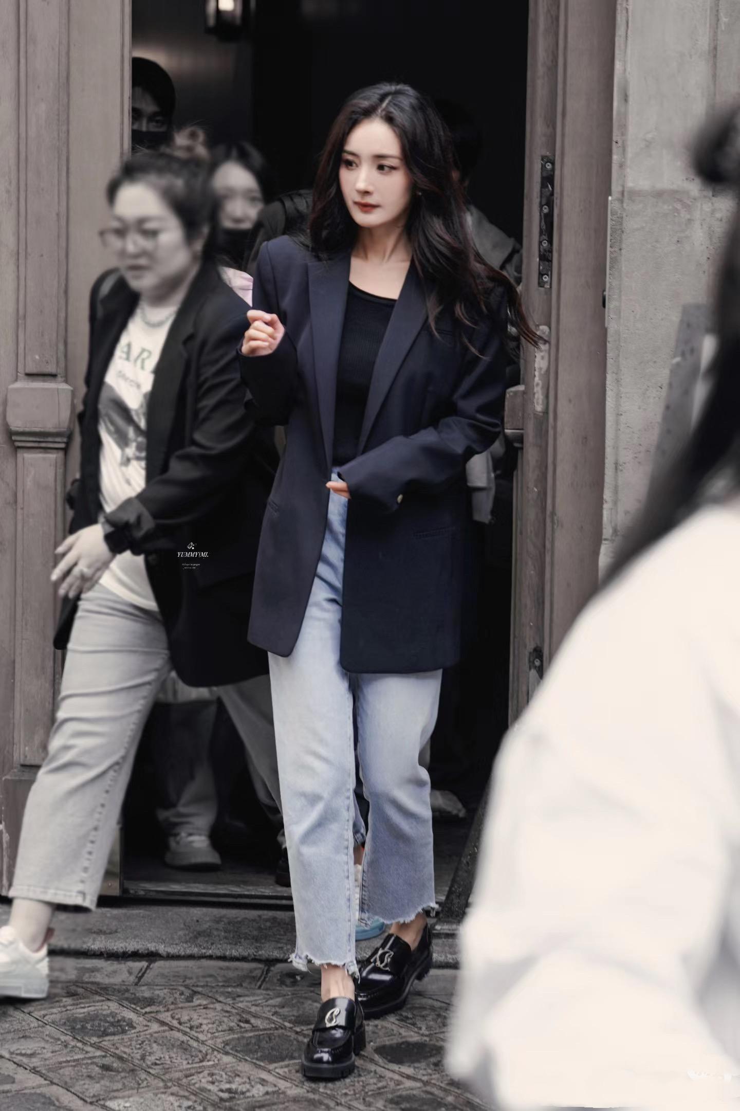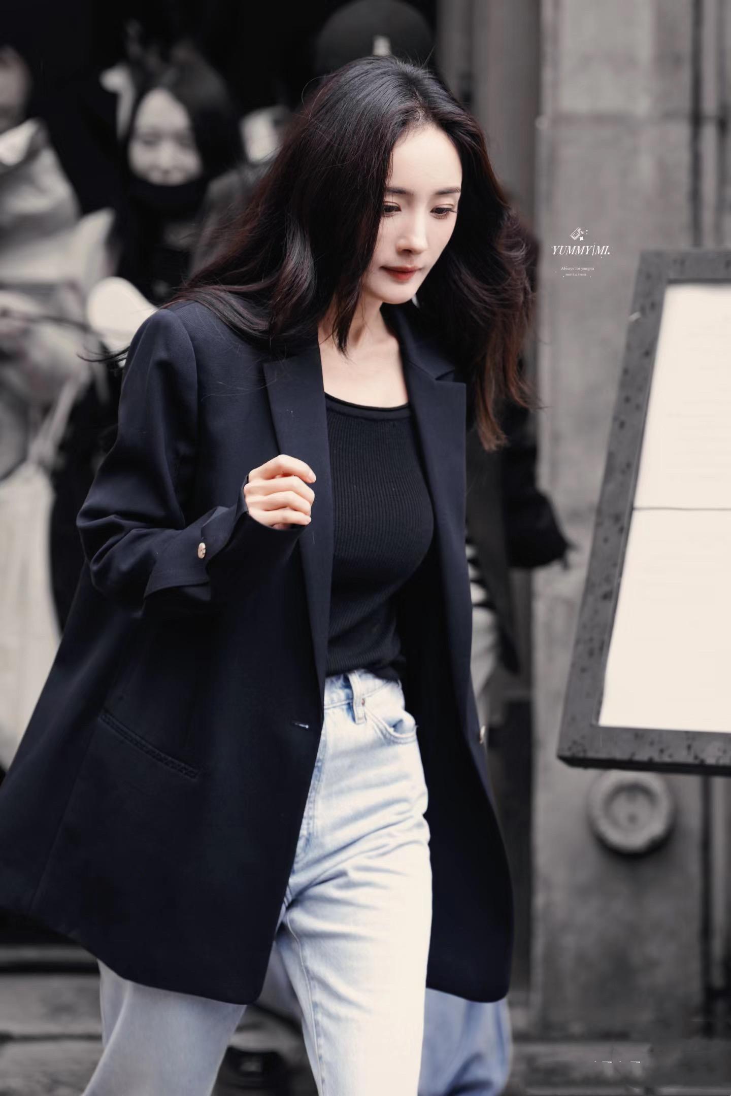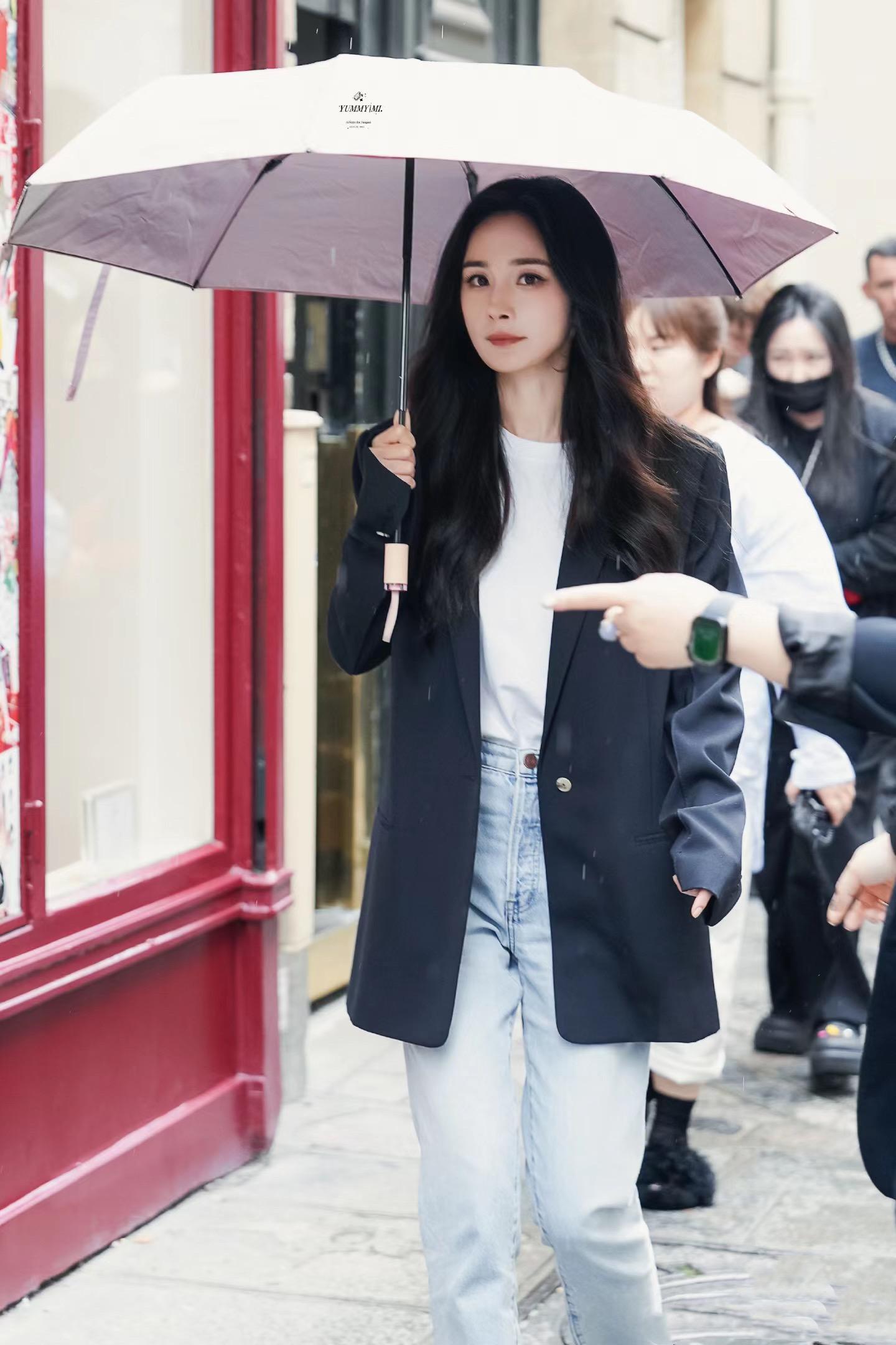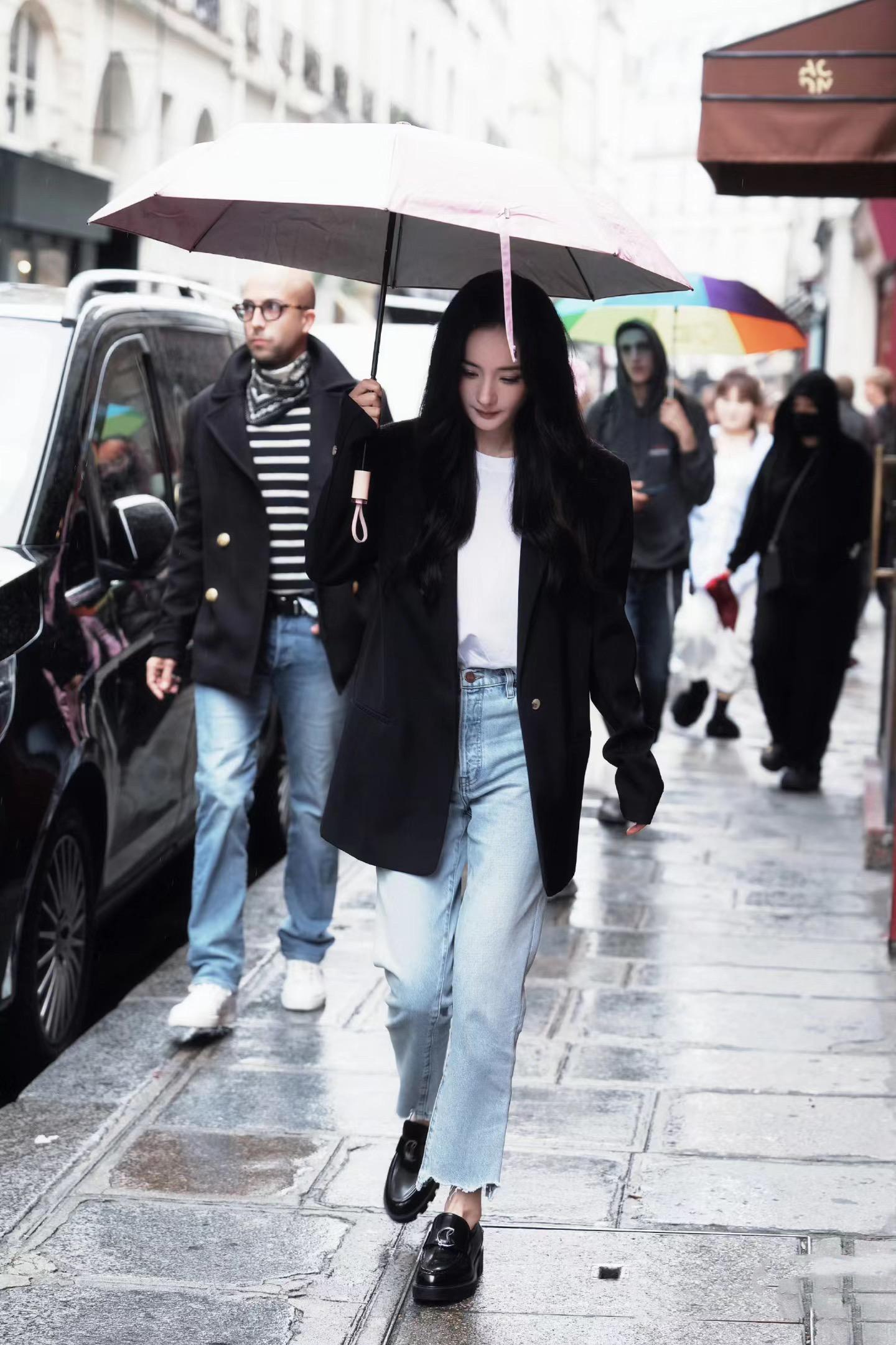 楊冪在巴黎街頭鯊瘋了,白T恤+黑西服+牛仔褲,青春洋溢太美了