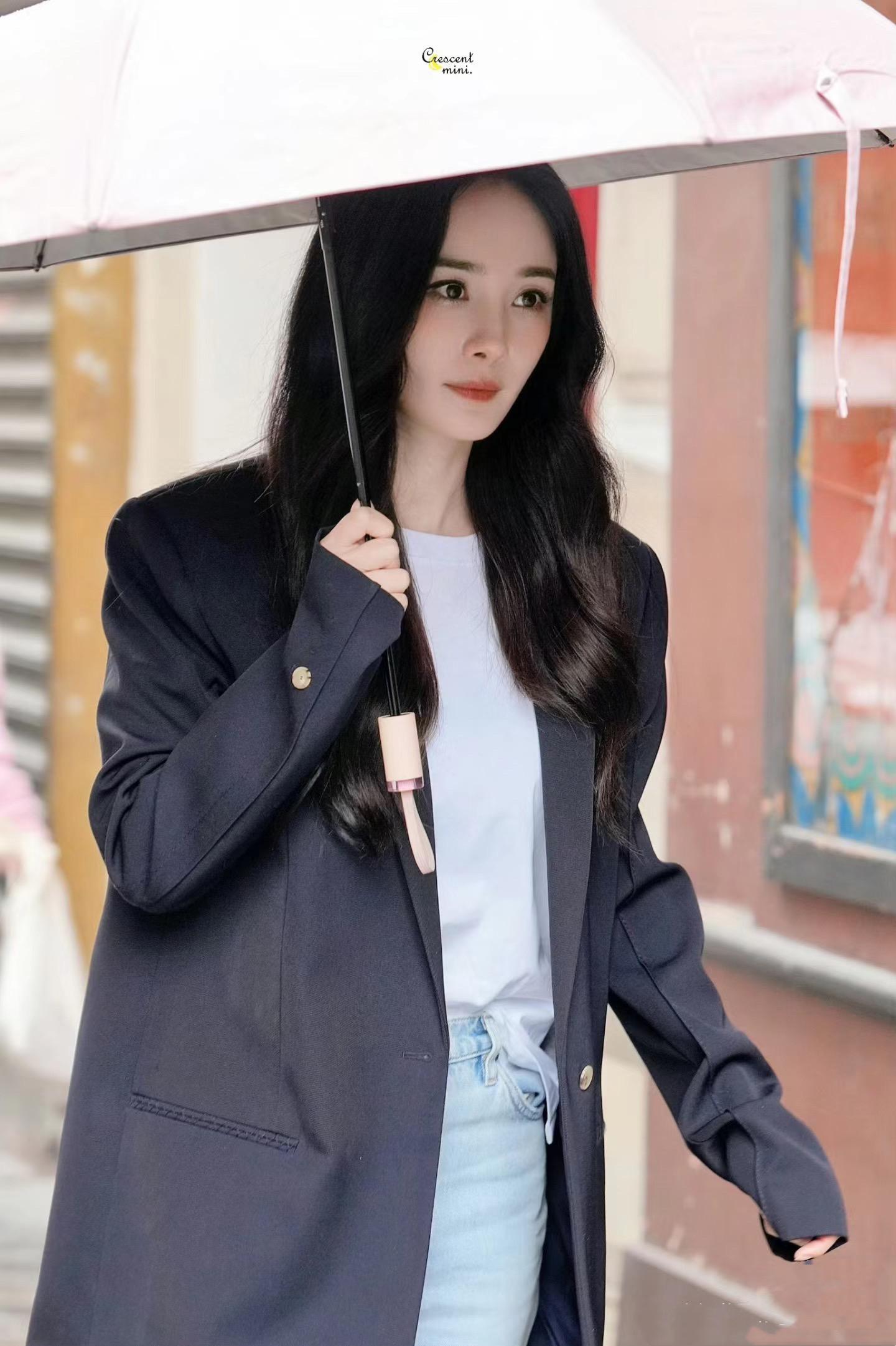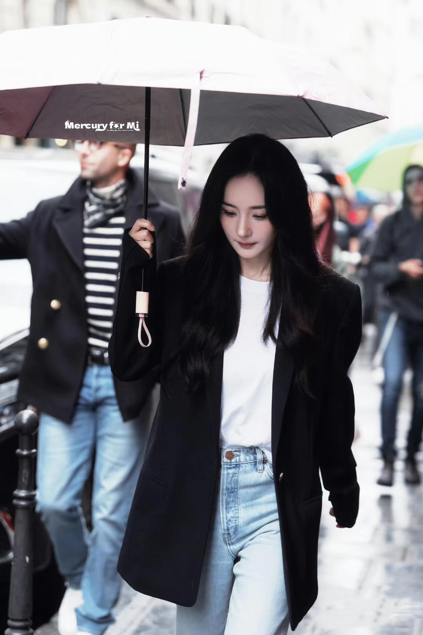 哪怕是日常中比較基礎常規的單品,在楊冪的巧妙搭配下,也會呈現出新的時尚。撐着雨傘走在巴黎街頭,楊冪的穿搭也成爲當之無愧的焦點。