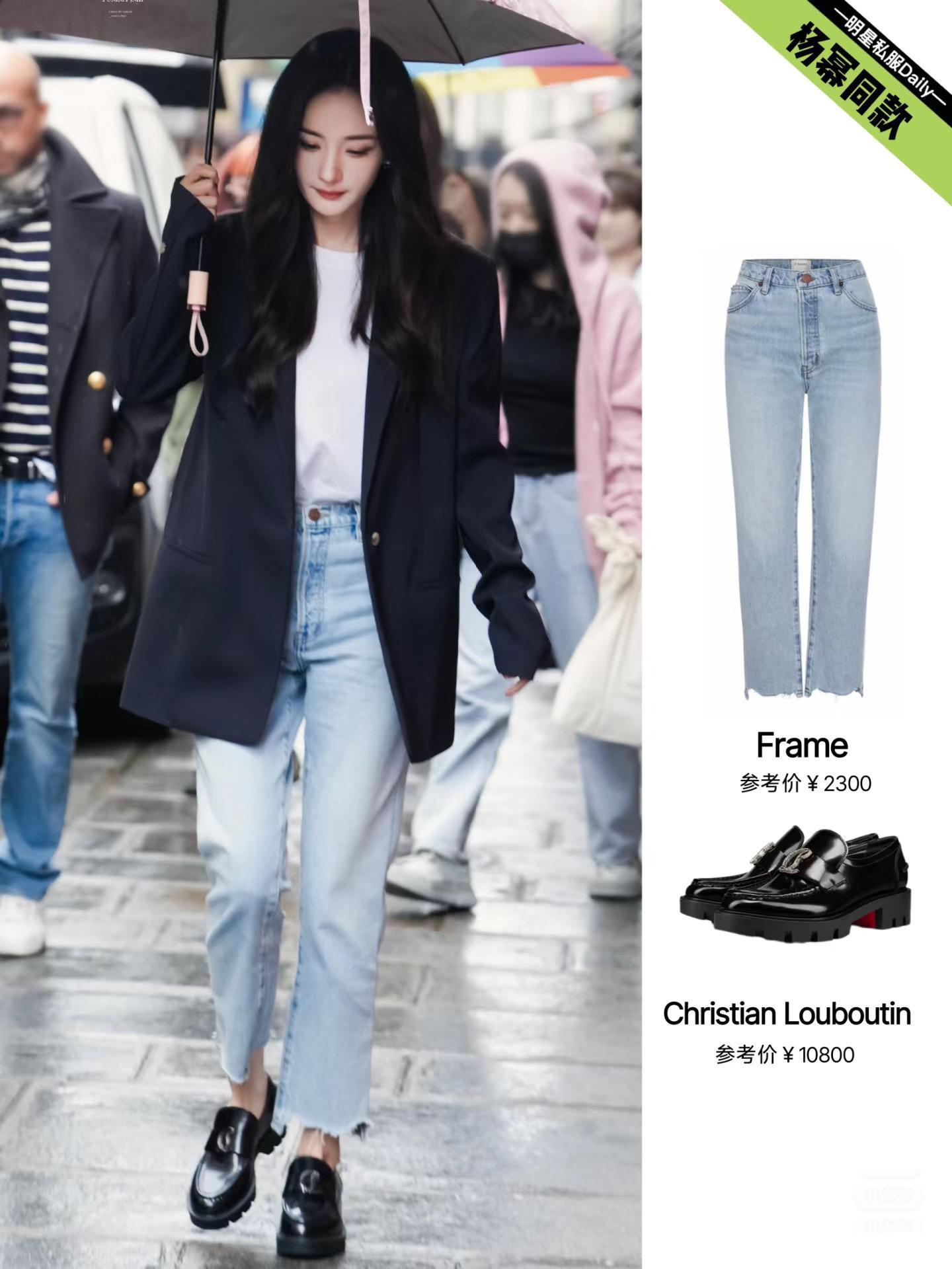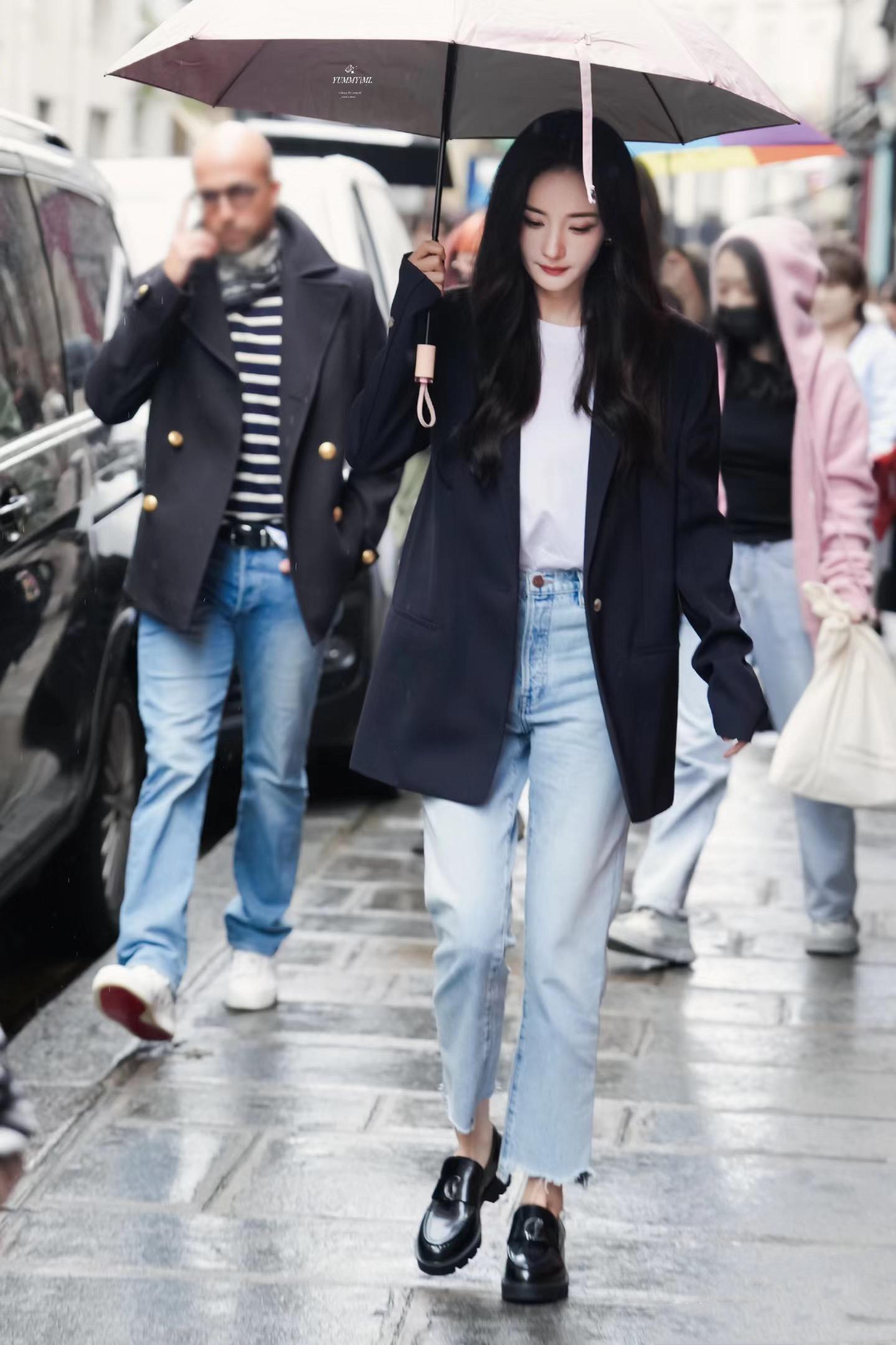 看楊冪的這組穿搭,簡潔又不失腔調,走在巴黎街頭也是鯊瘋了。基礎的黑色西服、淺藍色牛仔褲、配一雙厚底樂福鞋就很洋氣。