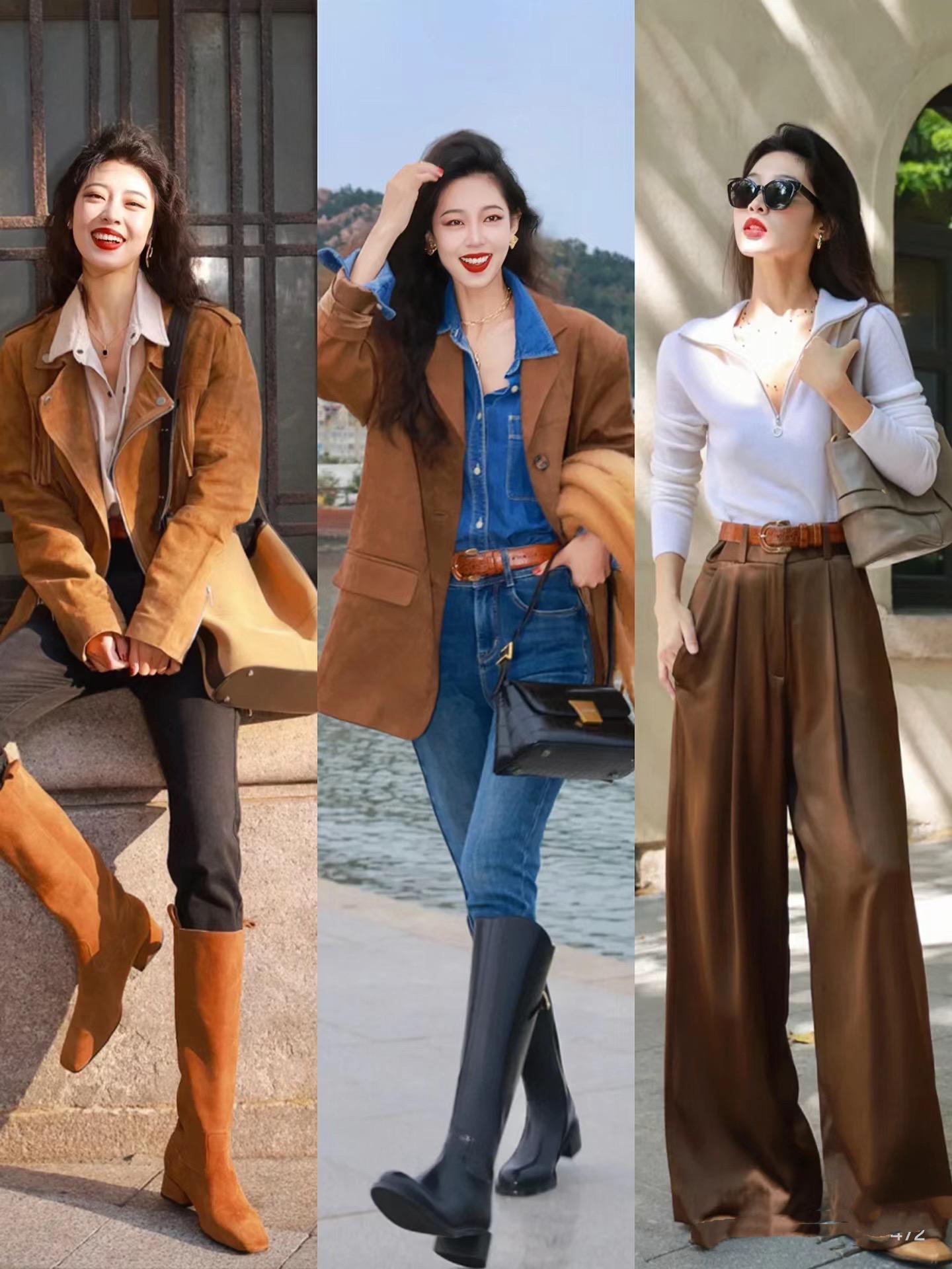 深棕色的西服外套、及膝長靴、闊腿褲,就能拉滿更濃郁的秋日氛圍。深棕色的西服、與同色系的短靴,把復古風情拉滿。