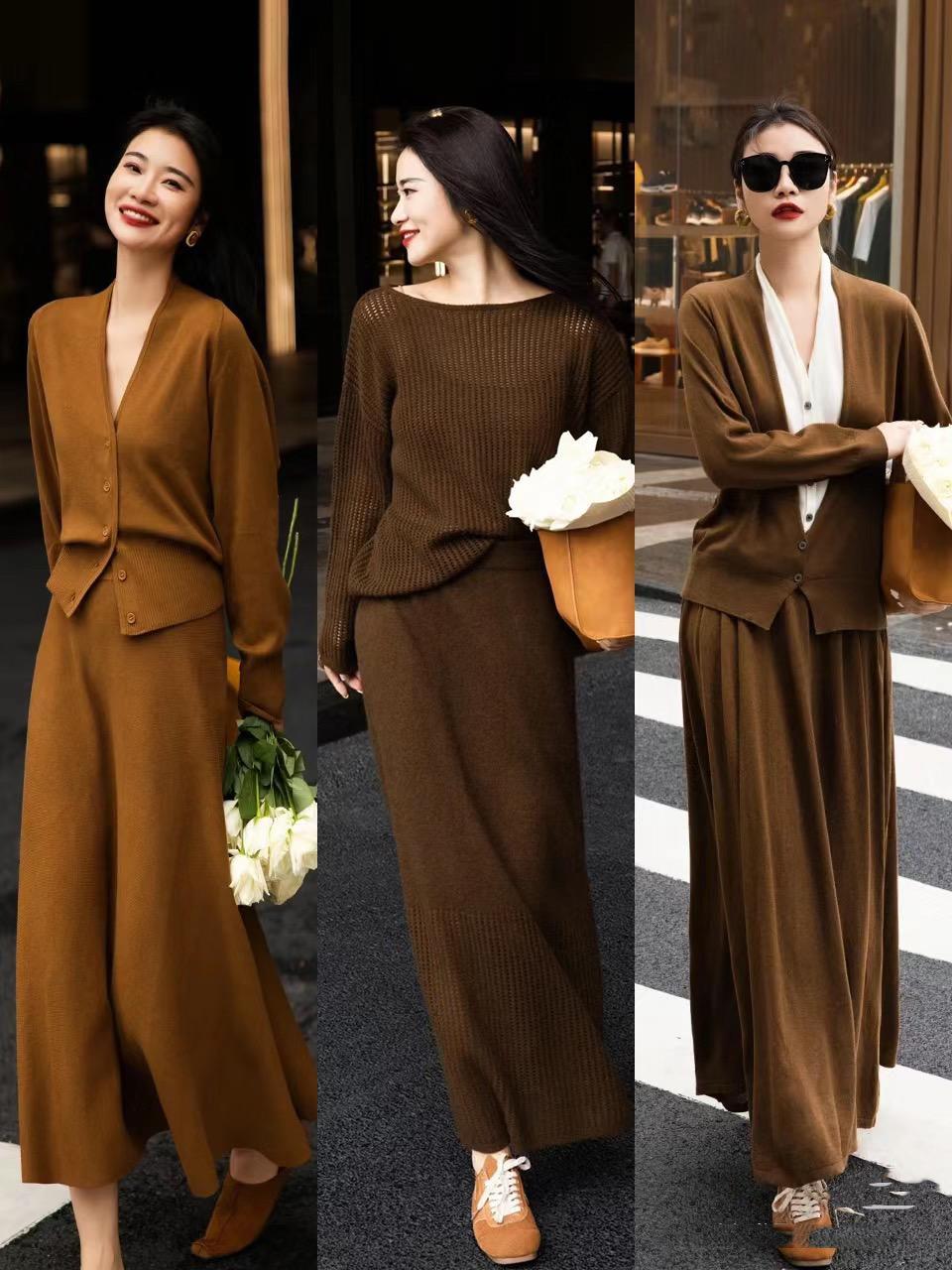 睡眼朦朧的早晨,就在棕色系裏尋找那份溫暖吧。棕色系的針織套裝、舒適慵懶也寫滿了大氣。