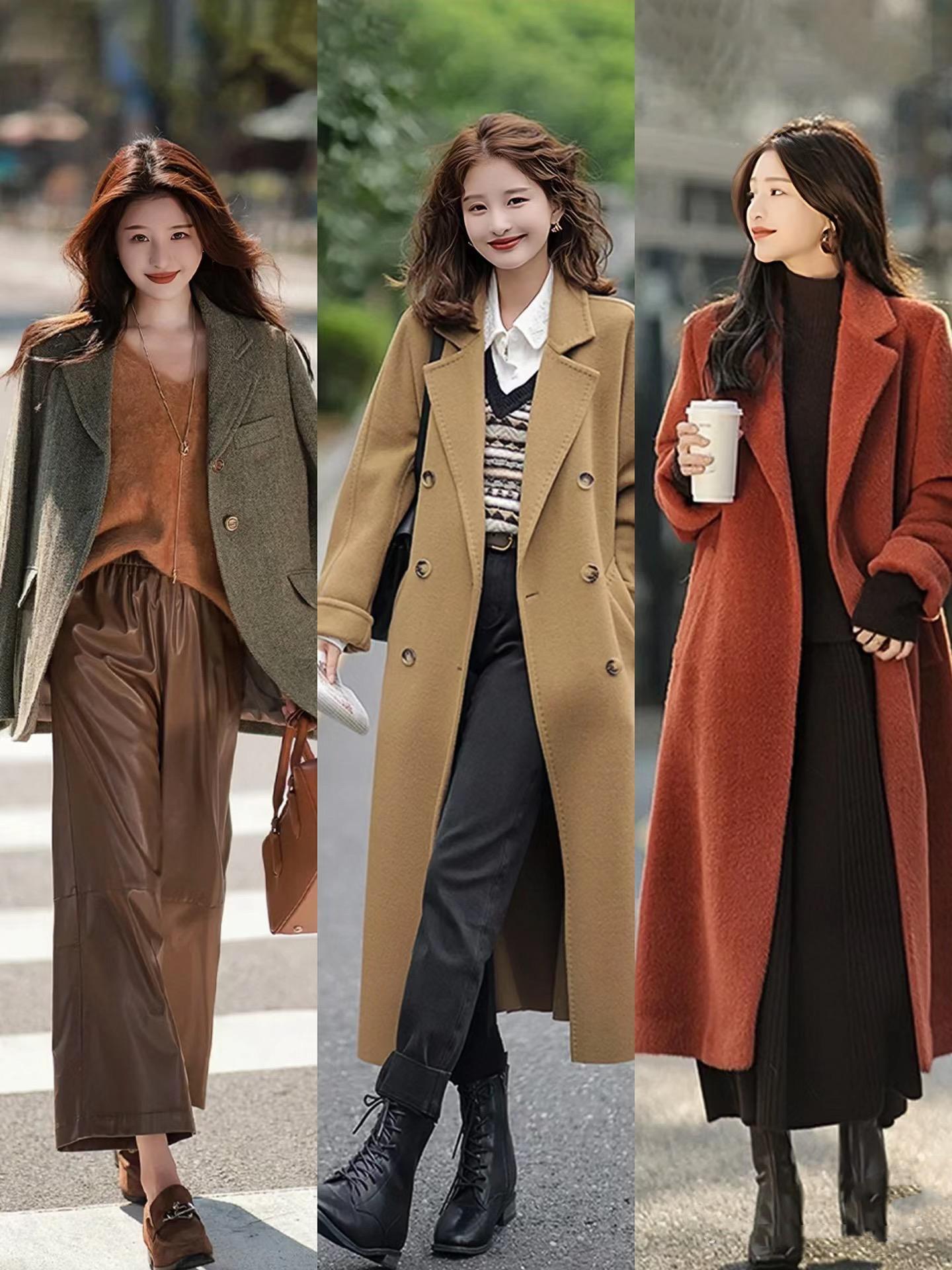 H型棕色大衣,可以配白襯衫+針織馬甲,帶着高冷知識分子風,讓極簡穿搭更有變十足。棕色雙排扣大衣,也是超有氣場。