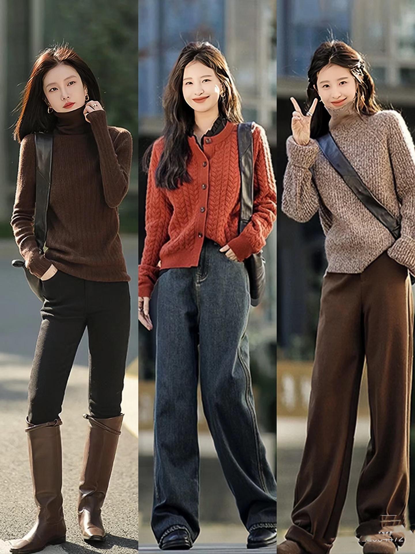 棕色系的針織衫、棕色系的高腰褲、棕色系的短靴,也是很好穿又不挑人的單品。不想標新立異,就選擇更經典的組合搭配。