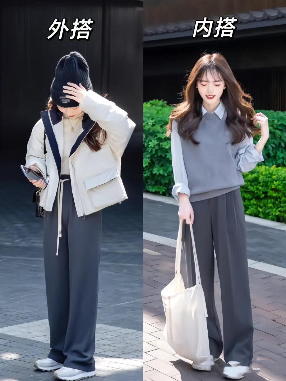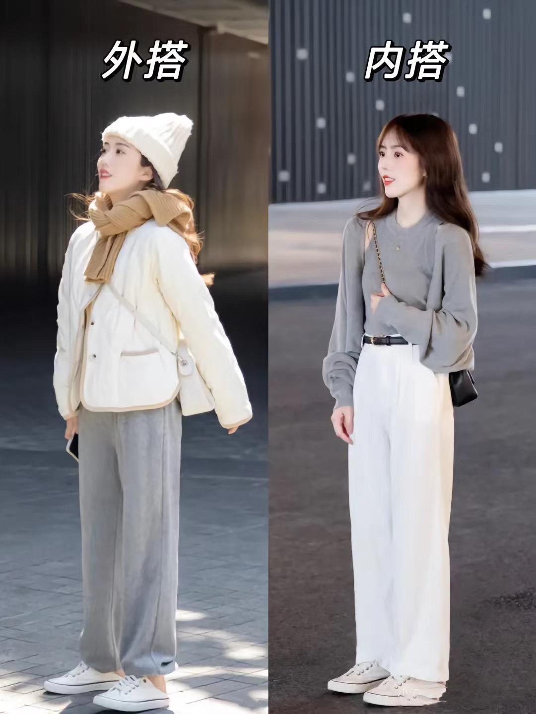 高腰的白色直筒褲,很顯高、也很利落。天冷的時候,還可以搭配短款的小棉服,繫上圍巾更保暖。這種直筒褲的穿搭、簡潔又有範。