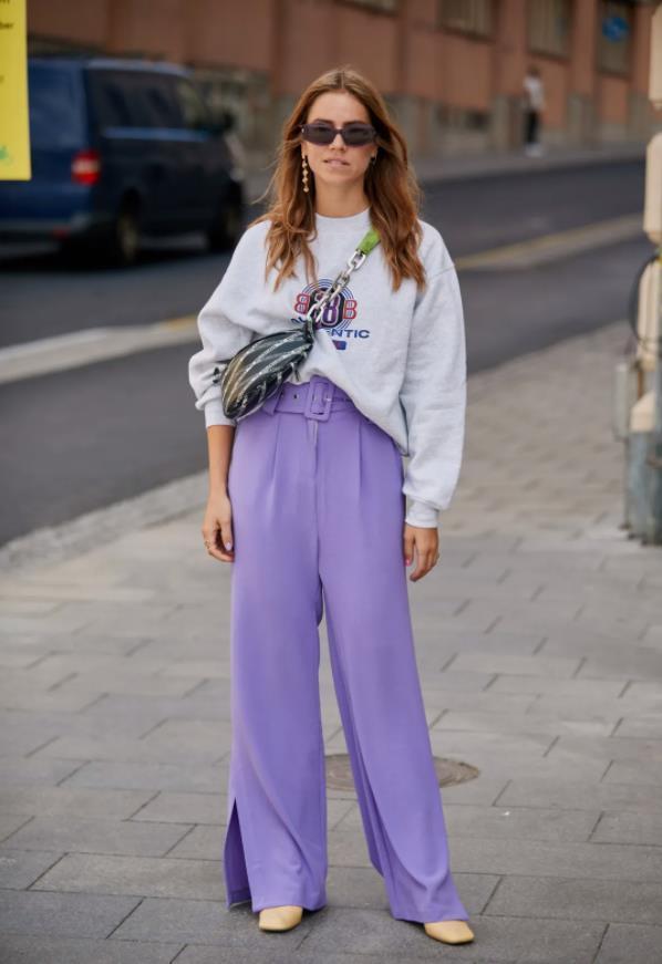 灰色套頭衛衣+紫色闊腿褲,因爲灰色是經典色,無論與什麼顏色組合,都是沒有問題的,這兩種顏色搭配一起,把人的膚色都襯托得很白皙,也將女性的帥氣、優雅魅力盡顯,腳下搭配一雙平底鞋,休閒與鬆弛感就打造了。