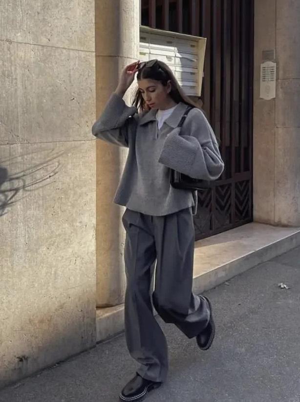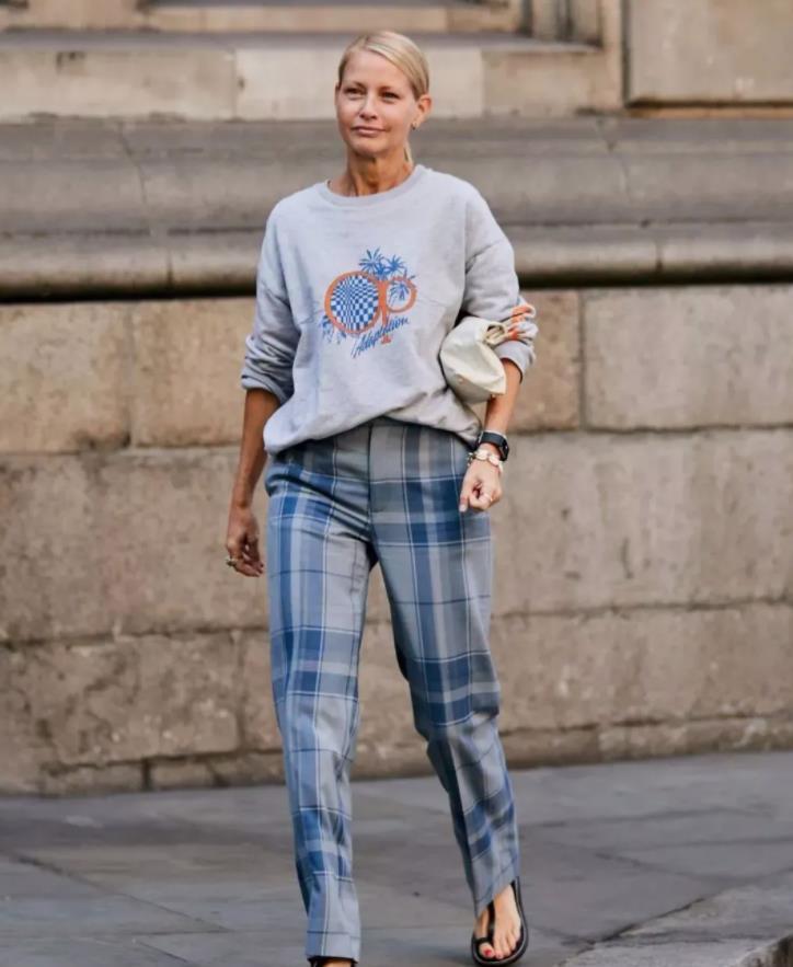 很基礎簡約的灰色衛衣,與灰色格紋闊腿褲相配,給人營造出一種隨性舒適的氛圍感,這樣的搭配有種不經意的知性和魅力,最重要的是很顯休閒舒服。