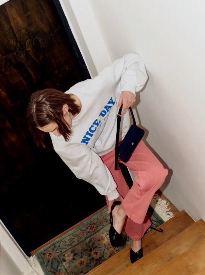 亮色的衛衣,能讓你看起來更精神一點,黃色圓領衛衣,搭配牛仔闊腿褲,這兩種搭配能輕鬆展現出灑脫和不羈,也顯得無拘無束,腳下搭配一雙尖頭平底鞋,衛衣稍微塞進去一點褲子裏面,顯得利落率性又能拉長腿部線條。
