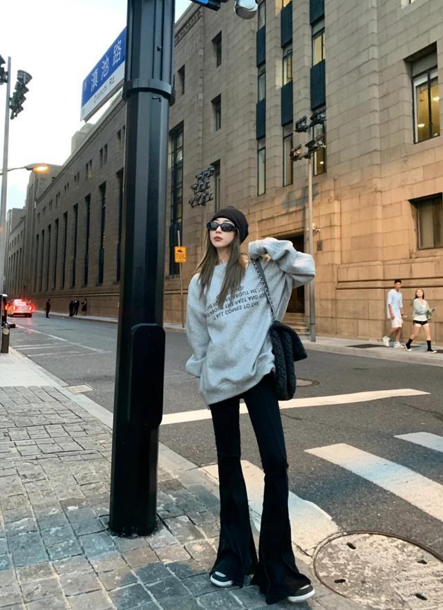 秋天又怎能沒有一件男友風的衛衣呢?寬鬆的版型,對身材沒有一點約束感,慵懶風十足,這種版型的衛衣,實在是太讓人喜歡了,搭配黑色微喇長褲,這種褲子瘦腿的效果超級棒的。