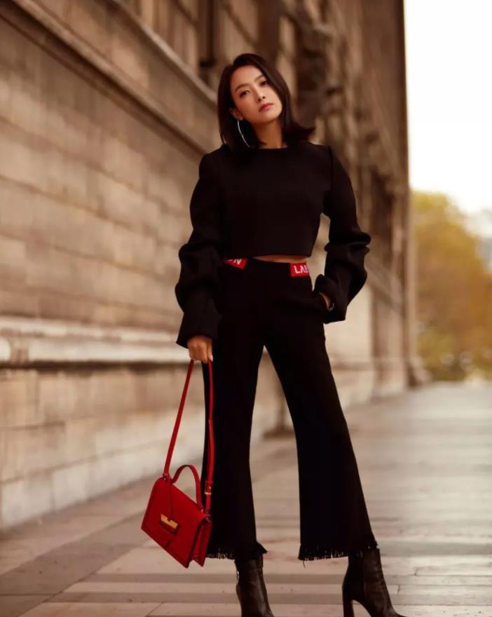一身黑色系的打扮,或許會有些沉悶,但只要你懂得運用一些配飾,或者是搭配技巧,就能降低沉悶感,黑色衛衣搭配黑色喇叭褲,剛柔並濟的感覺,這樣的穿搭隨性還不失颯爽,搭配一雙黑色高跟鞋,在視覺上能很好拉長腿部線條,同時也不失時髦和高級。