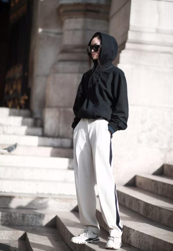 黑色連帽衛衣+白色闊腿褲,黑色和白色,無論怎麼穿都不會出錯,這樣的搭配,簡約卻不失個人魅力,腳下搭配一雙老爹運動鞋,就能穿出慵懶的調調了,反正就是挺時尚的一套。