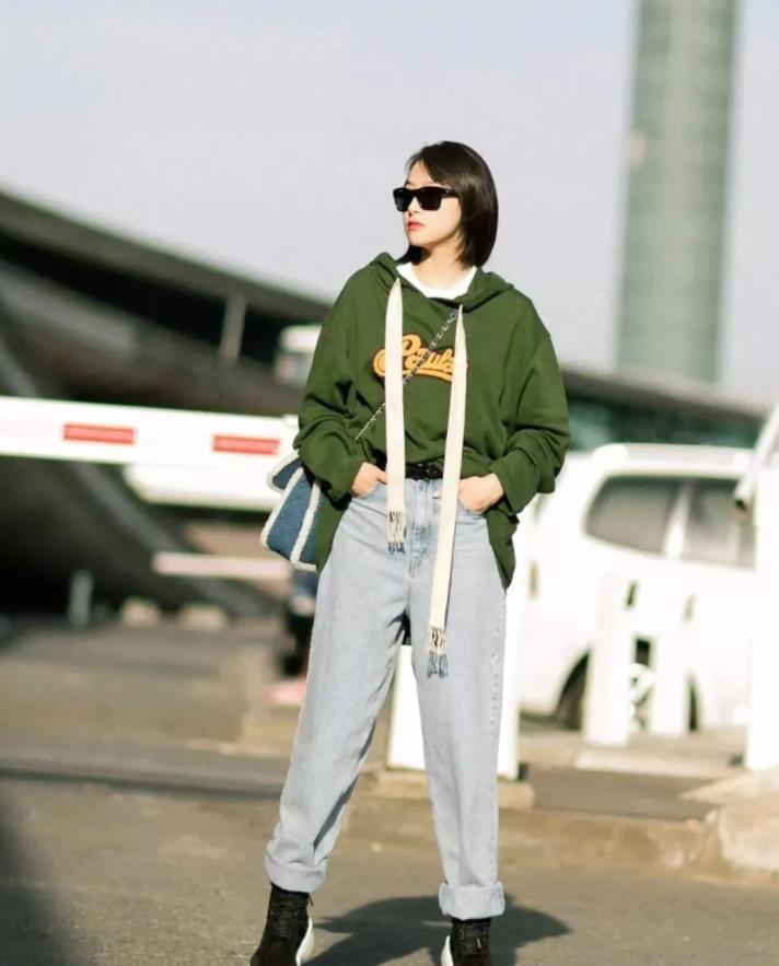 軍綠色的連帽衛衣,看着就有種帥氣感,搭配牛仔闊腿褲,整個着裝既不失隨性又帶着慵懶,衛衣寬鬆的版型,對身材包容性極佳的,也很藏肉顯瘦,看着簡單卻不失時髦,衛衣裏面疊穿一件白色打底,很好增加層次感,衛衣的下襬稍微塞一點進去褲子裏面,很顯利落,再搭配一雙黑色運動鞋,又多了幾分休閒的氣息。