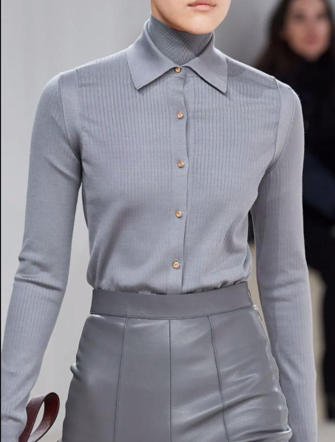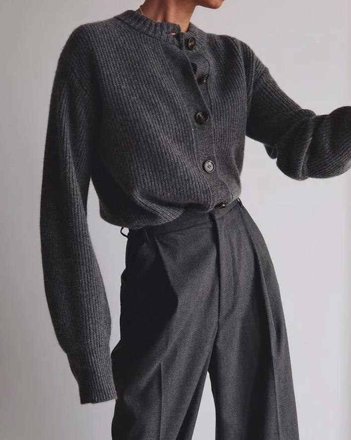 柔軟舒適的灰色羊毛小開衫,可以單穿,也可以內搭一件灰色高領打底,穿出一種自信和酷颯氣質,同色系、順色系的組合,不僅能減少配色的出錯率,也很時髦和高級,下裝搭配一條灰色皮褲,充滿力量感和柔美。