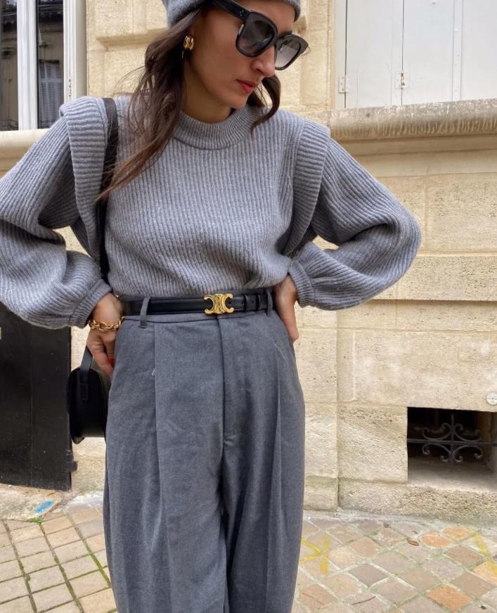 在秋冬季節,要說什麼是必不可少的,那一定非毛衣莫屬,灰色針織毛衣,搭配一件灰色西裝闊腿褲,穿出了一種獨立和自信感,看似簡單的搭配,卻非常顯高級,也不失女人味,腰間增加一根腰帶進行點綴,就很顯簡約和幹練了,盡情展現出個人的魅力。